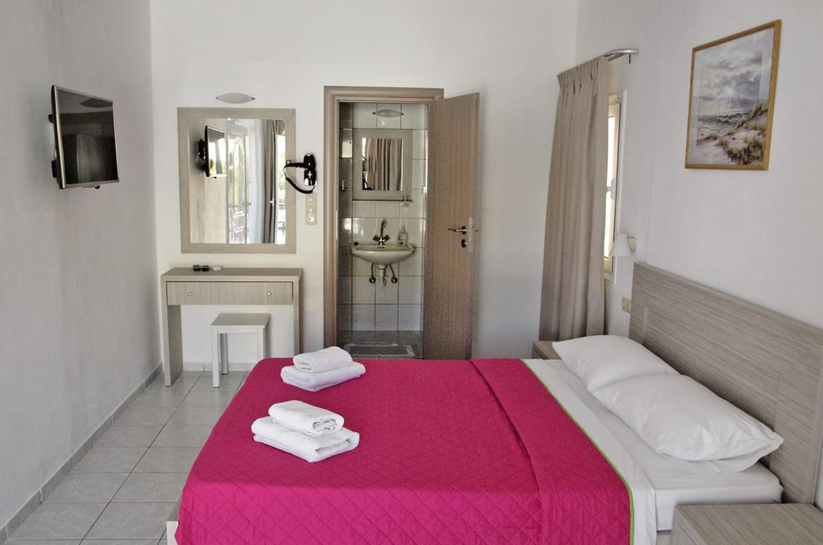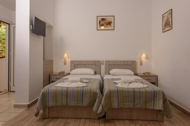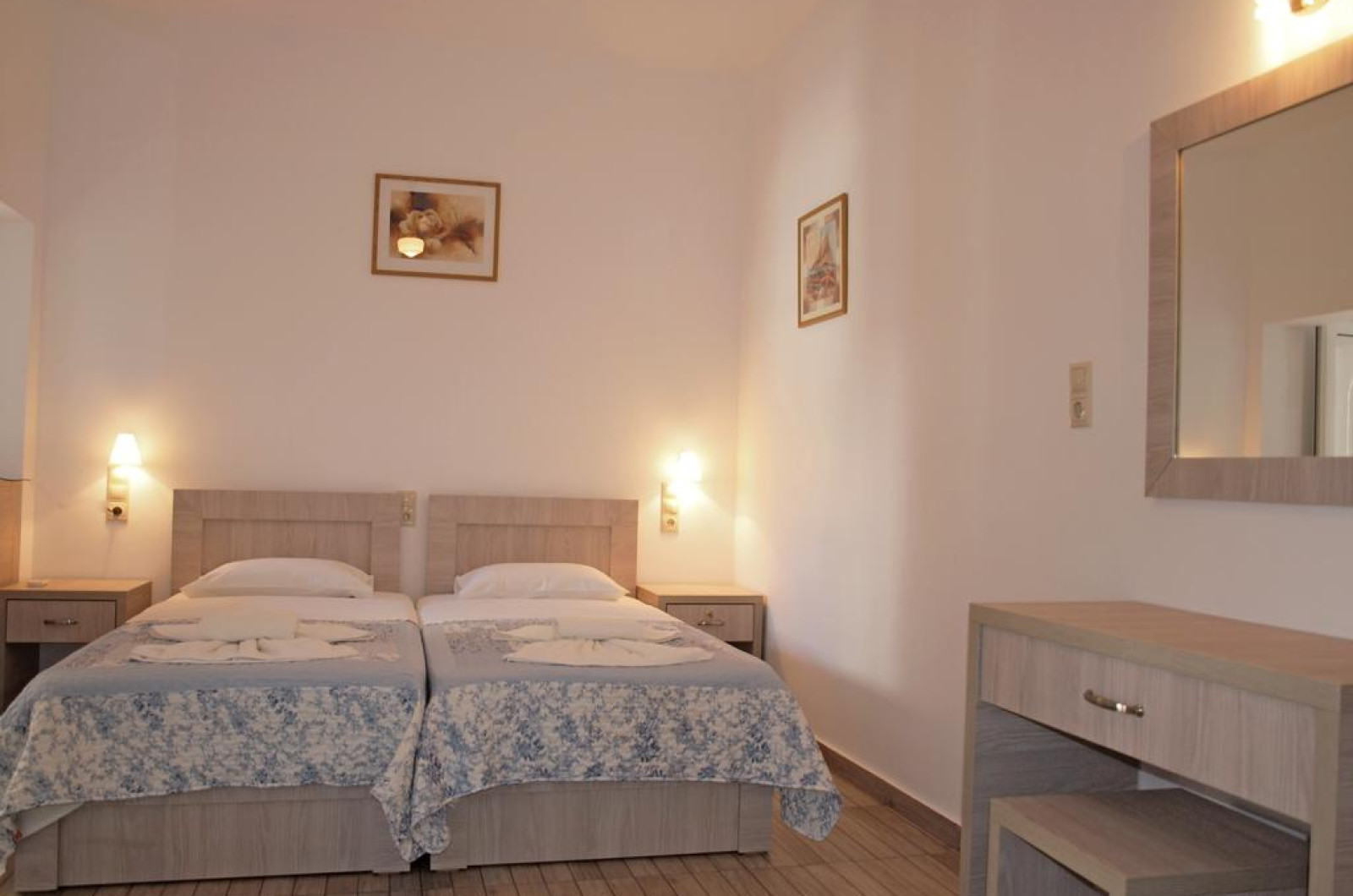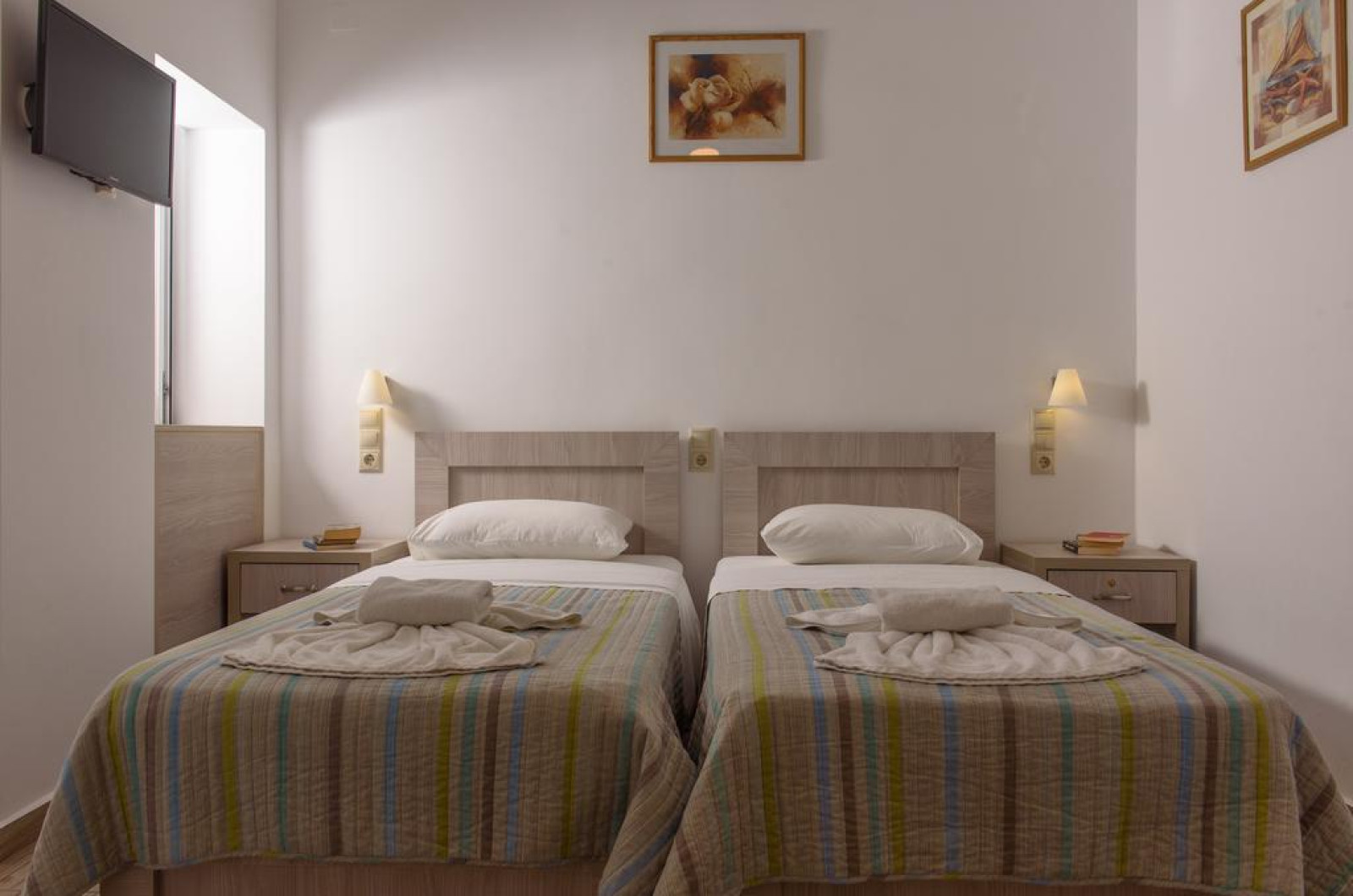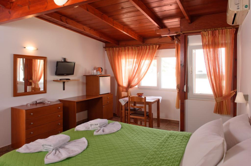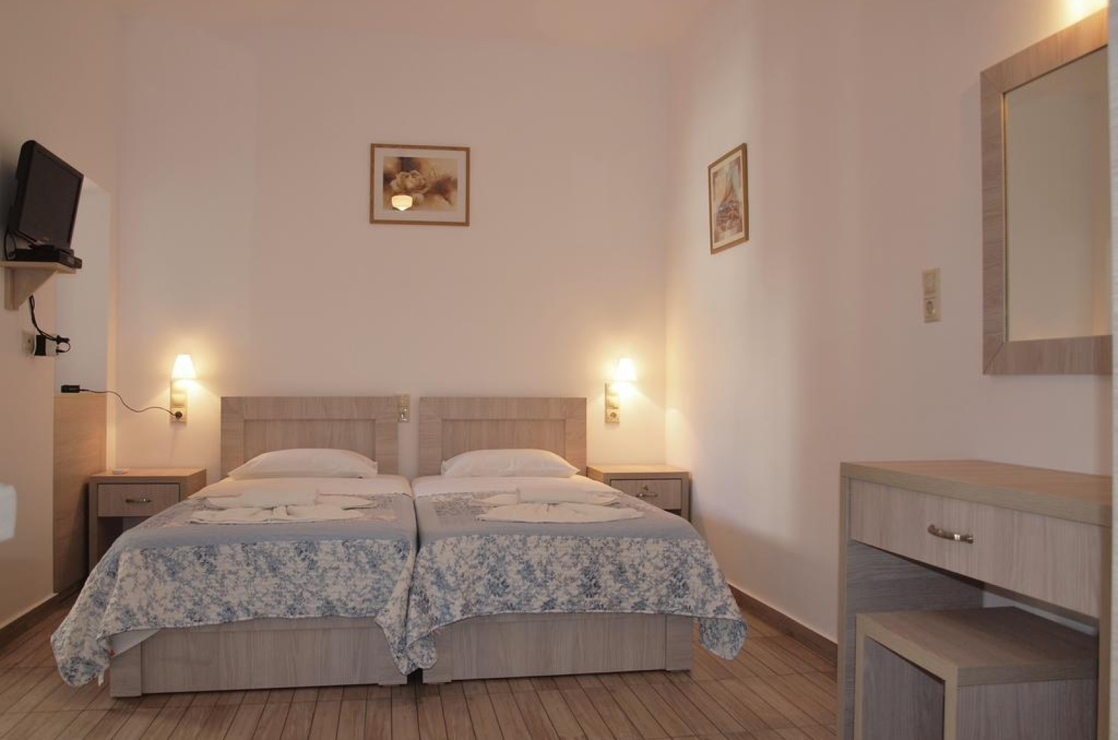 Fiecare cameră dispune de mașină pentru preparare cafea sau ceai și fierbător Unele camere au balcon cu vedere la mare sau la grădină. În camere există baie cu cadă sau duș prevăzută cu foehn. Camerele confortabile de la Nikos Hotel au pardoseală de gresie/ marmură, aer condiționat, Tv cu canale prin satelit și seif. Oaspeții au acces gratuit la serviciul Wi-fi în camere. Curățenia in cameră se face zilnic. Fiecare unitate de cazare include o chicinetă utilată cu frigider, plită de gătit și ustensile de bucătărie. Proprietatea oferă camere pentru familie cu o suprafață mai mare și un număr mai mare de paturi față de cele standard.