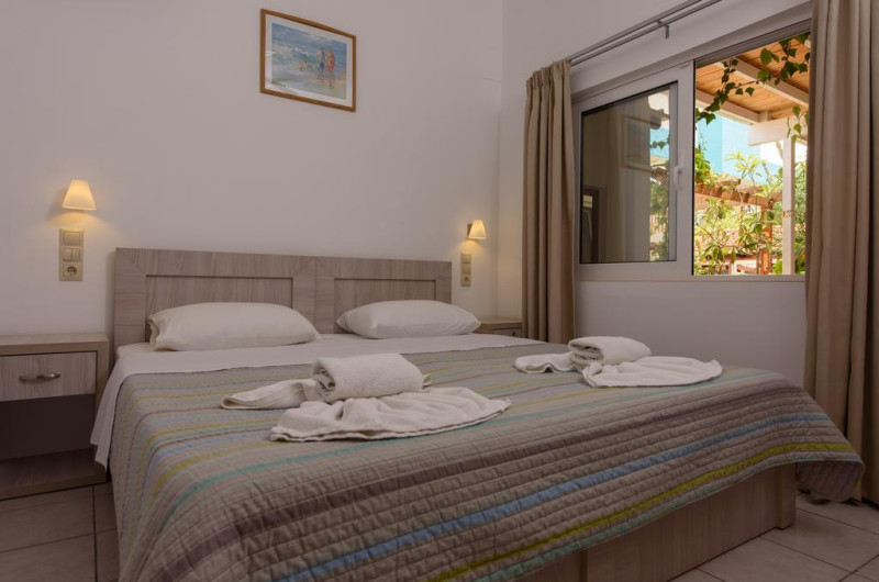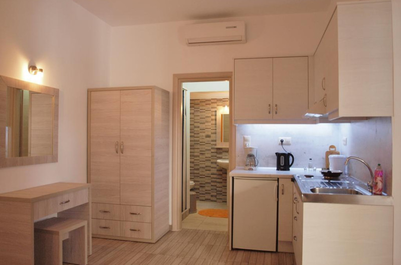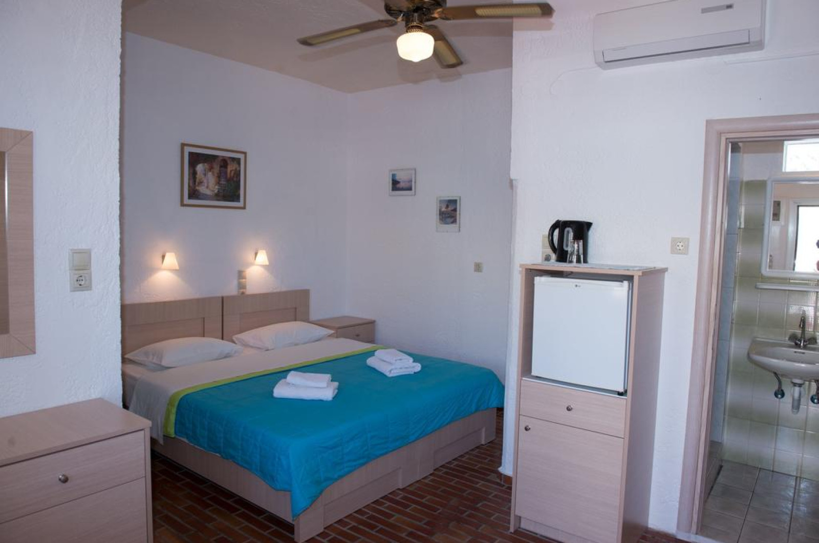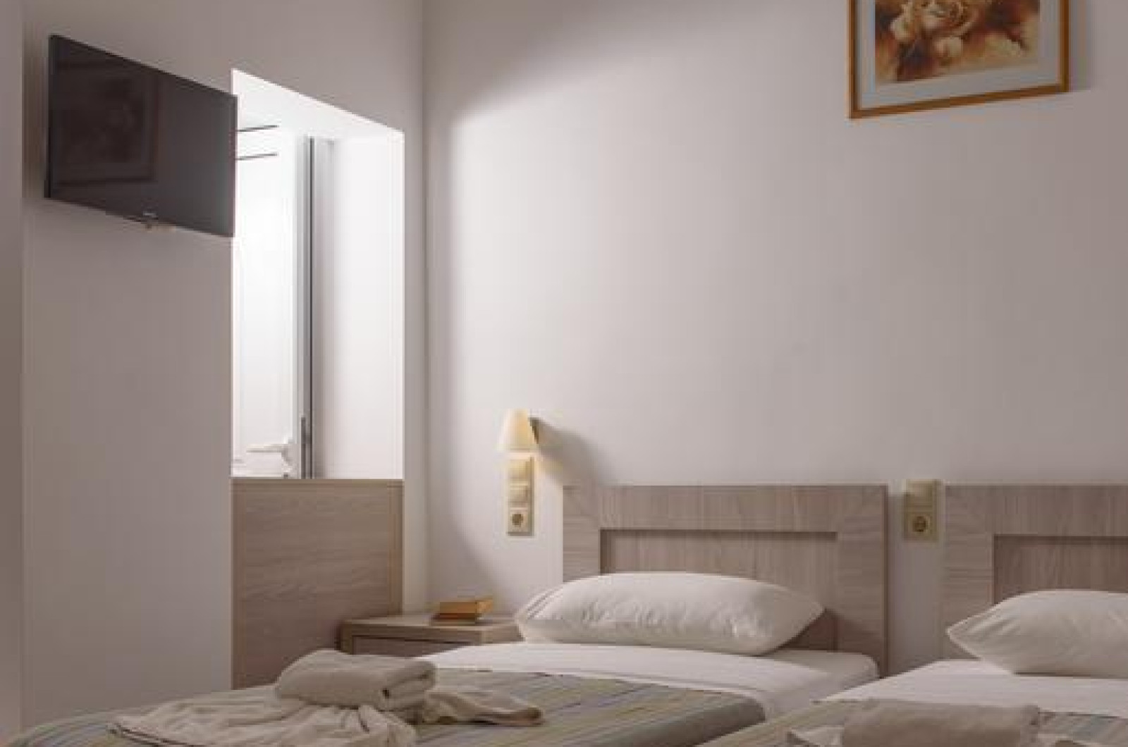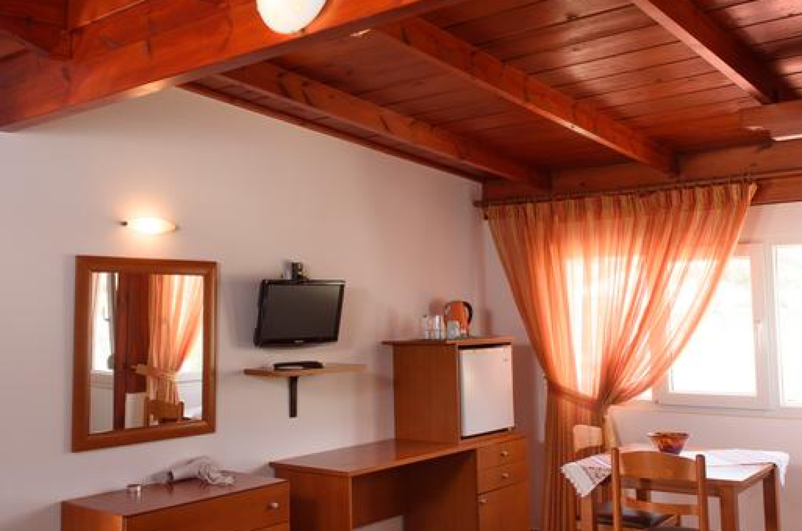 Fiecare cameră dispune de mașină pentru preparare cafea sau ceai și fierbător Unele camere au balcon cu vedere la mare sau la grădină. În camere există baie cu cadă sau duș prevăzută cu foehn. Camerele confortabile de la Nikos Hotel au pardoseală de gresie/ marmură, aer condiționat, Tv cu canale prin satelit și seif. Oaspeții au acces gratuit la serviciul Wi-fi în camere. Curățenia in cameră se face zilnic. Fiecare unitate de cazare include o chicinetă utilată cu frigider, plită de gătit și ustensile de bucătărie. Proprietatea oferă camere pentru familie cu o suprafață mai mare și un număr mai mare de paturi față de cele standard.