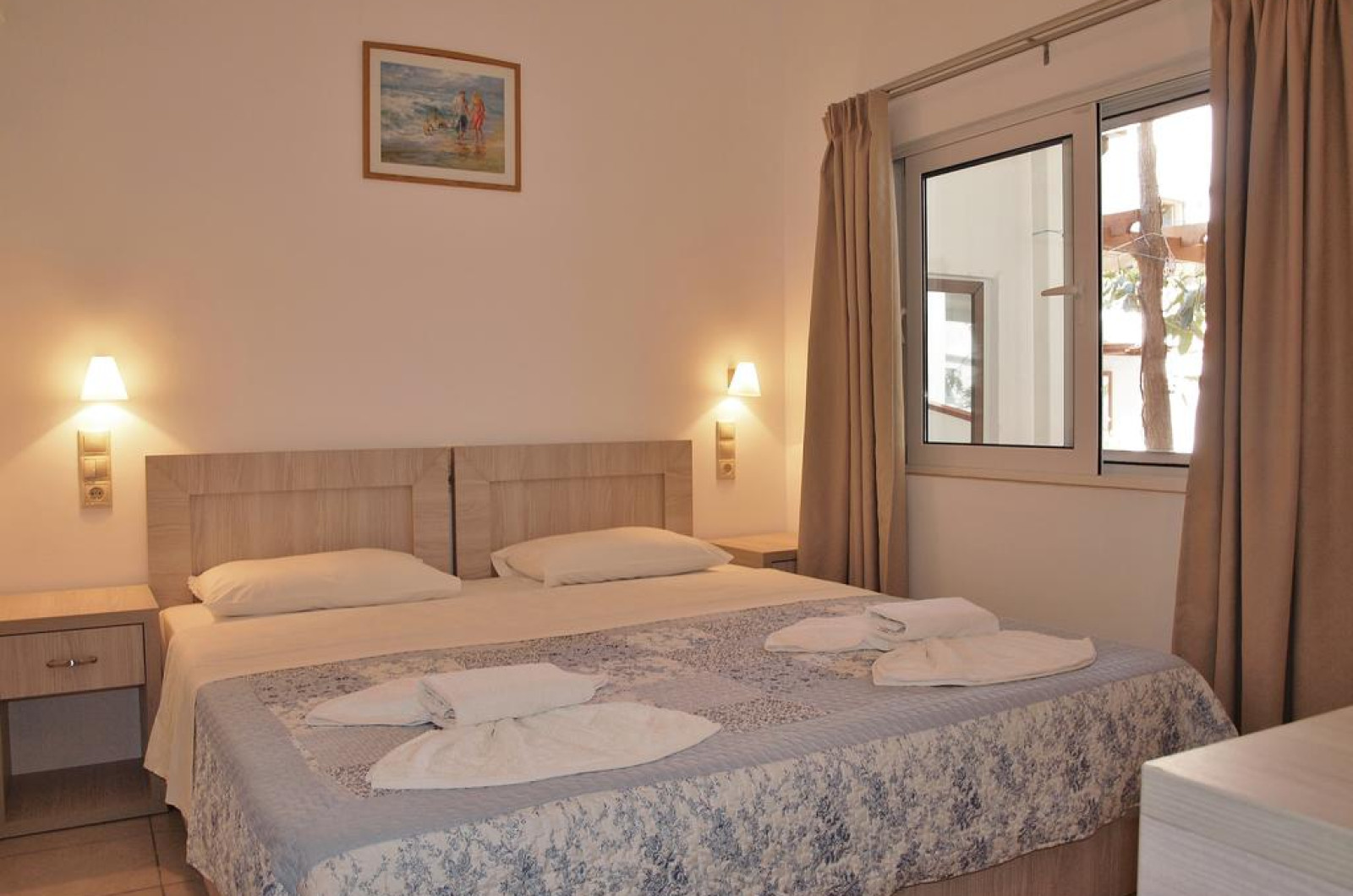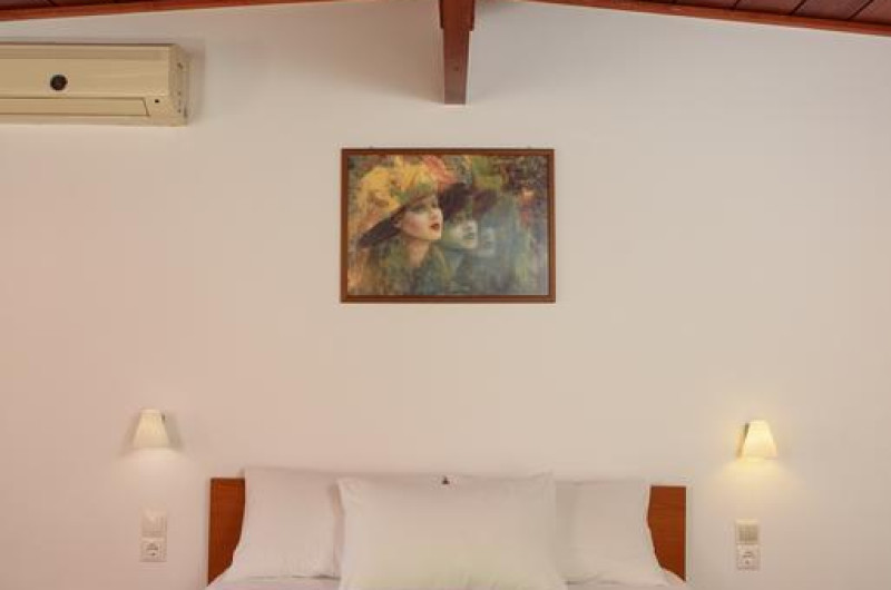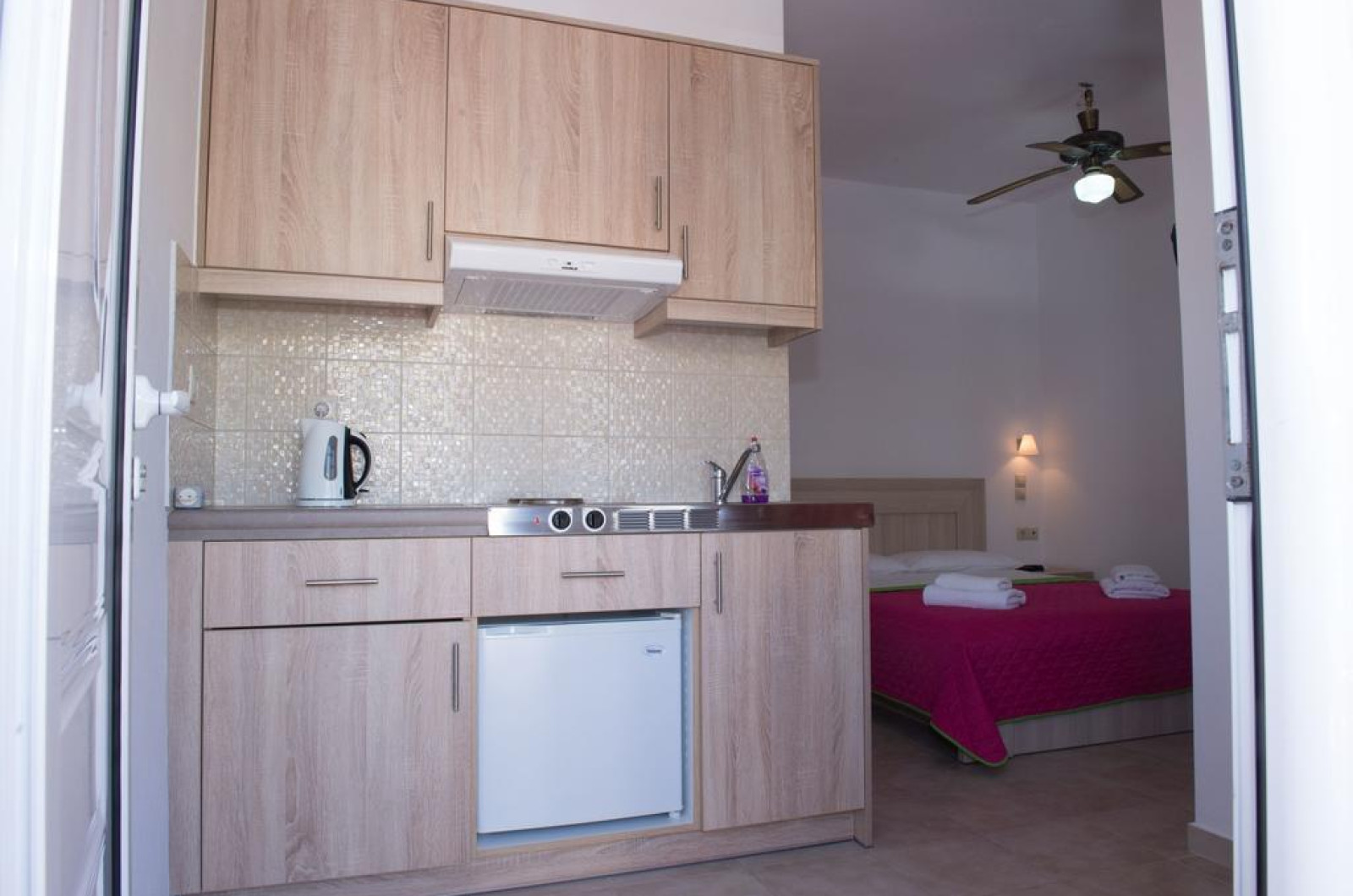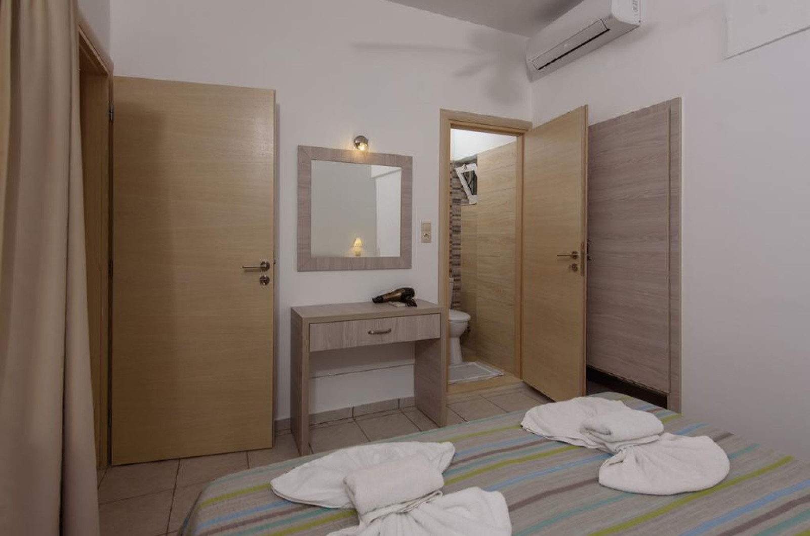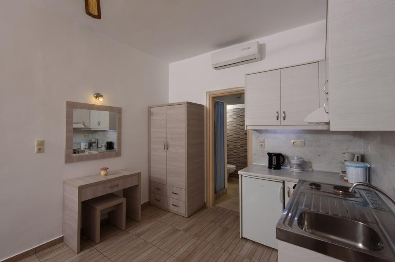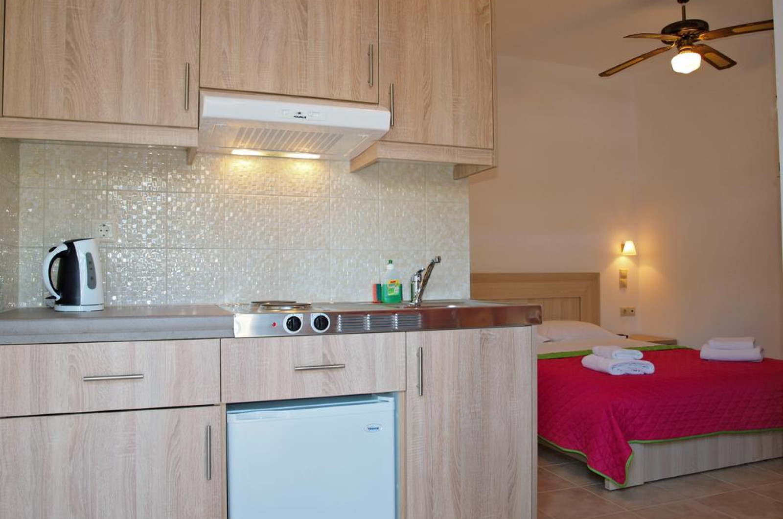 Fiecare cameră dispune de mașină pentru preparare cafea sau ceai și fierbător Unele camere au balcon cu vedere la mare sau la grădină. În camere există baie cu cadă sau duș prevăzută cu foehn. Camerele confortabile de la Nikos Hotel au pardoseală de gresie/ marmură, aer condiționat, Tv cu canale prin satelit și seif. Oaspeții au acces gratuit la serviciul Wi-fi în camere. Curățenia in cameră se face zilnic. Fiecare unitate de cazare include o chicinetă utilată cu frigider, plită de gătit și ustensile de bucătărie. Proprietatea oferă camere pentru familie cu o suprafață mai mare și un număr mai mare de paturi față de cele standard.