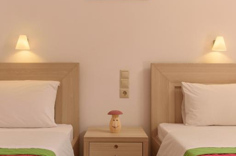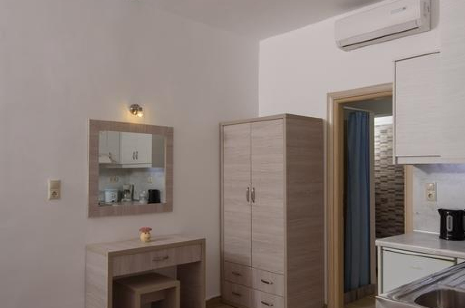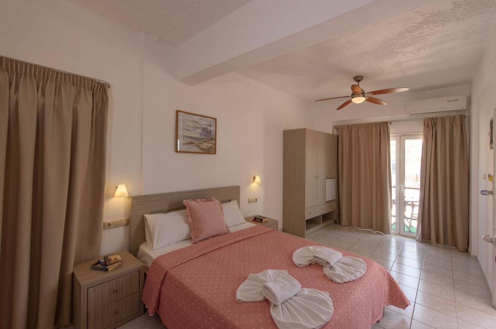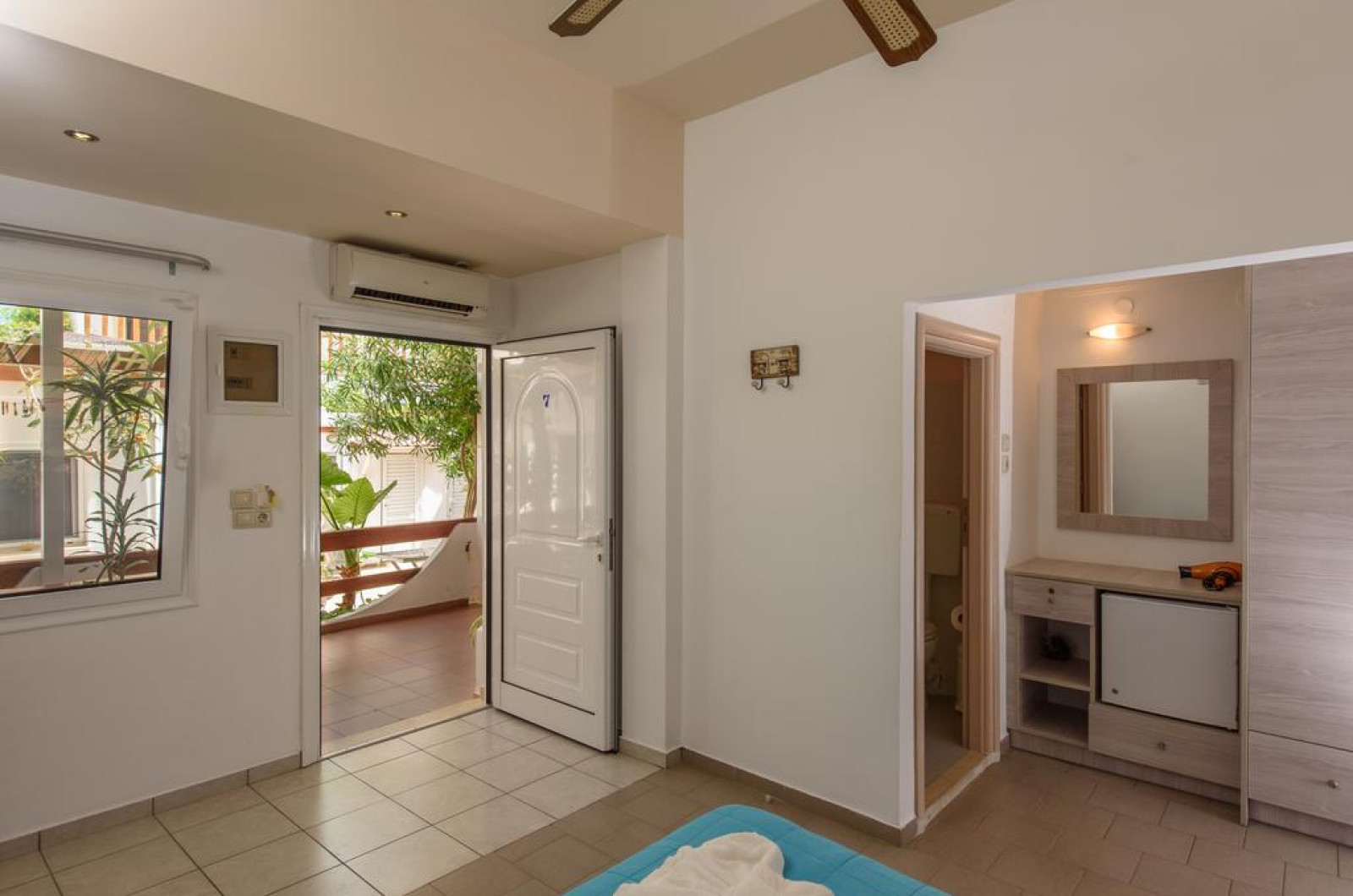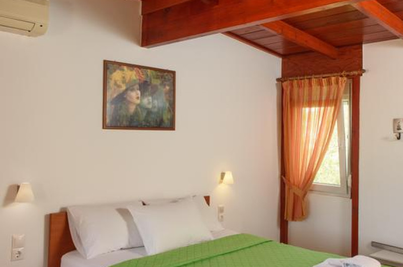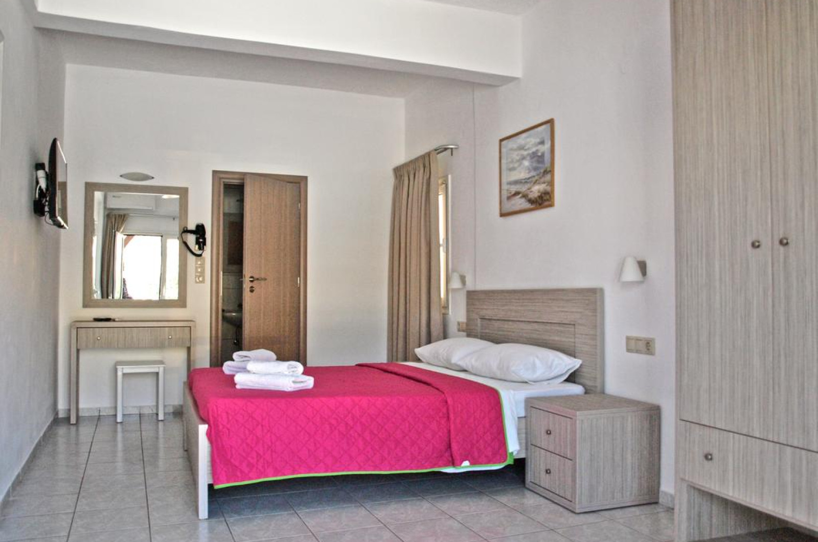 Fiecare cameră dispune de mașină pentru preparare cafea sau ceai și fierbător Unele camere au balcon cu vedere la mare sau la grădină. În camere există baie cu cadă sau duș prevăzută cu foehn. Camerele confortabile de la Nikos Hotel au pardoseală de gresie/ marmură, aer condiționat, Tv cu canale prin satelit și seif. Oaspeții au acces gratuit la serviciul Wi-fi în camere. Curățenia in cameră se face zilnic. Fiecare unitate de cazare include o chicinetă utilată cu frigider, plită de gătit și ustensile de bucătărie. Proprietatea oferă camere pentru familie cu o suprafață mai mare și un număr mai mare de paturi față de cele standard.
