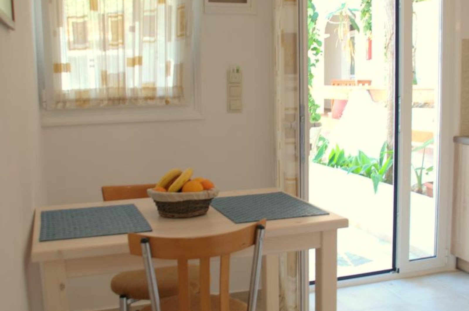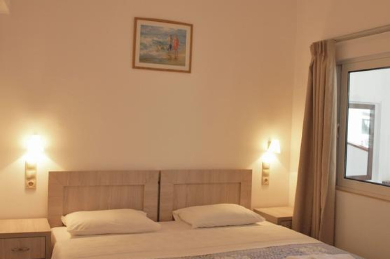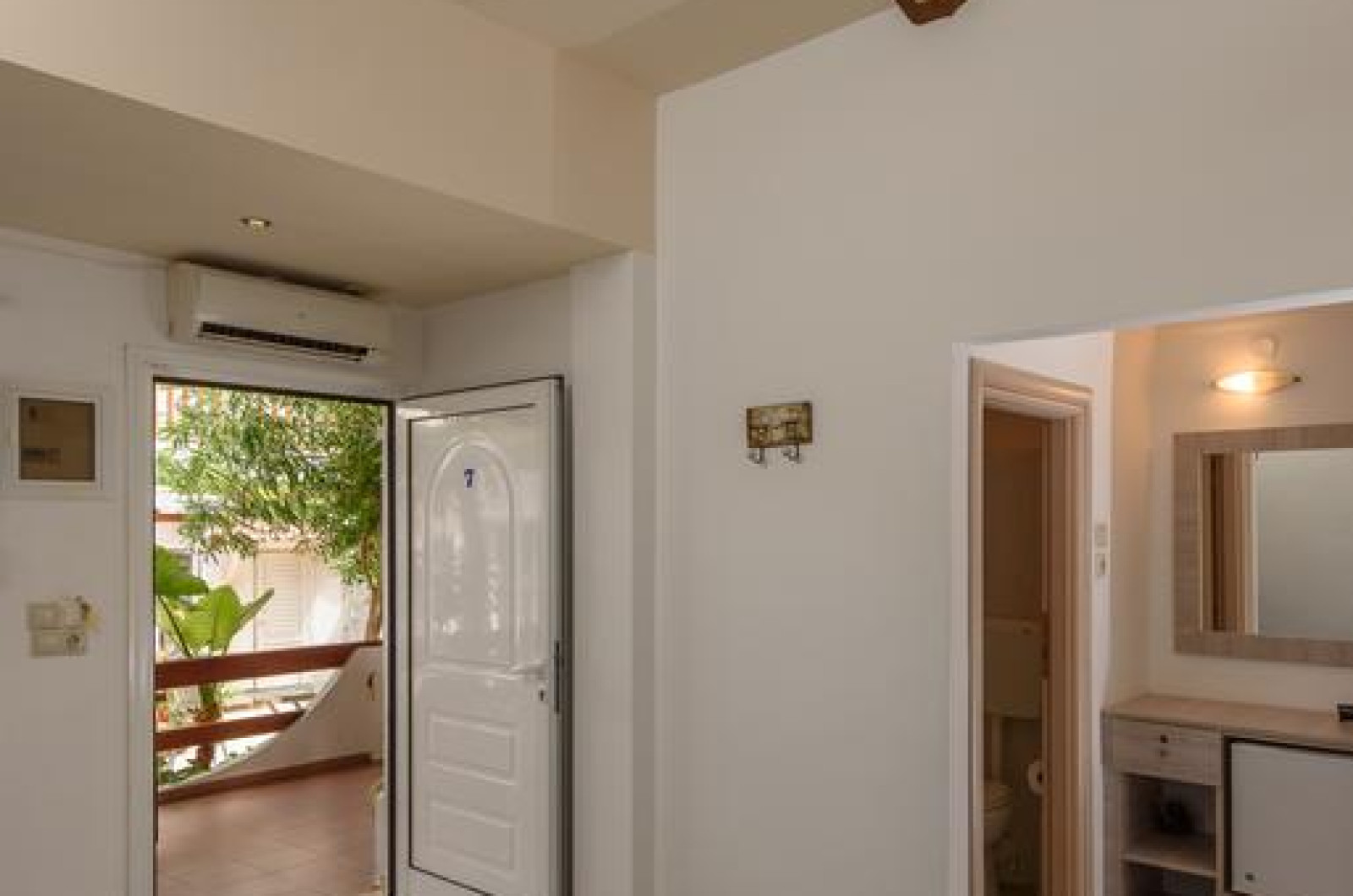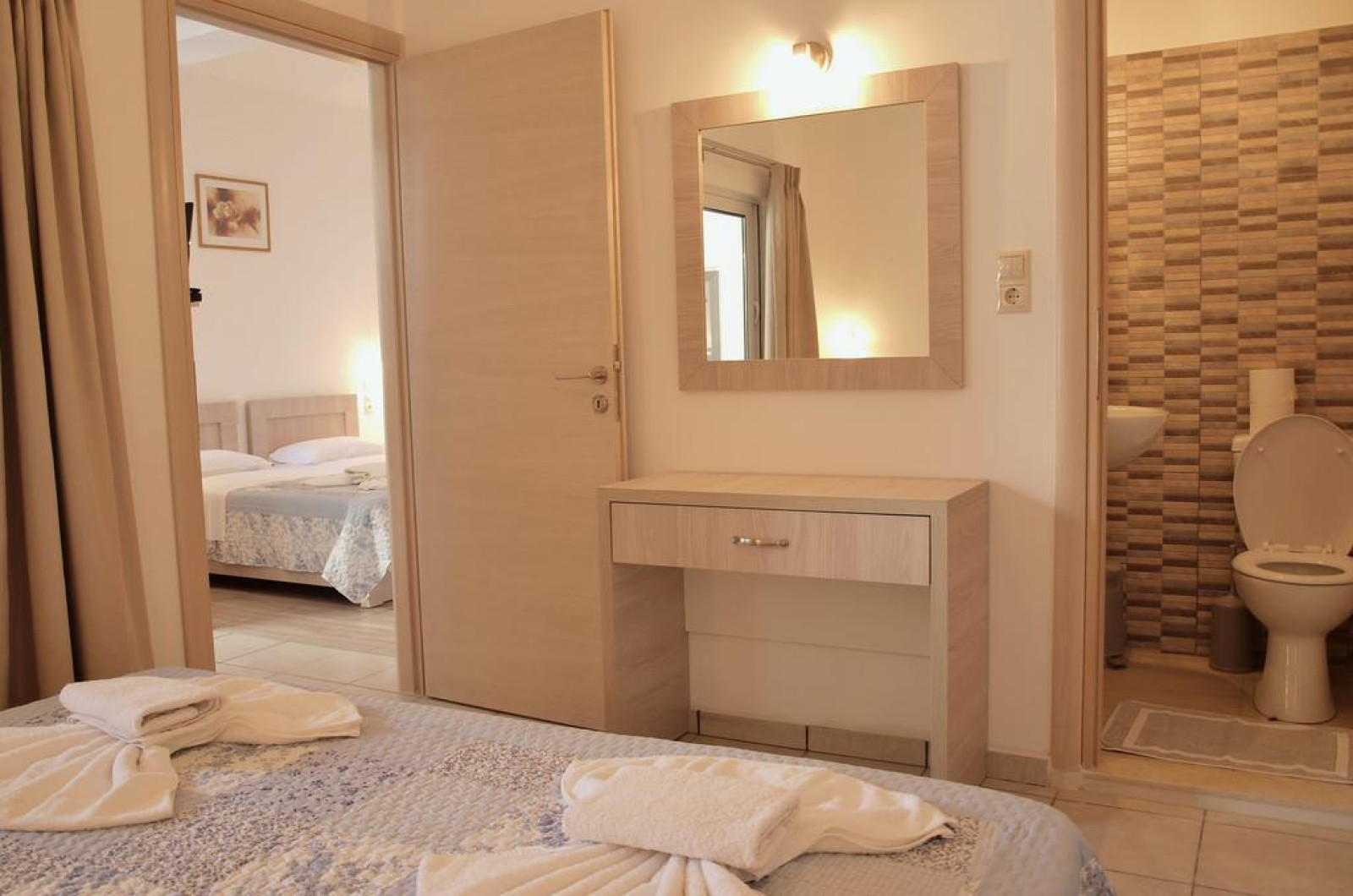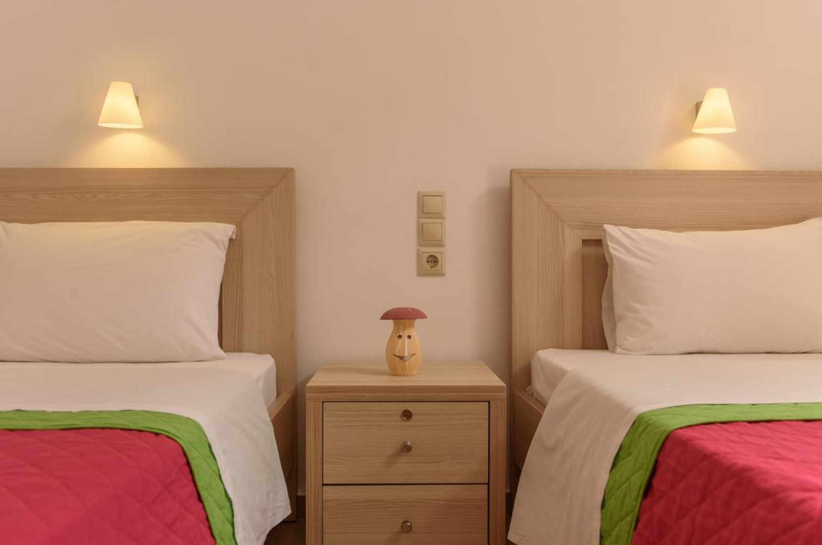 Fiecare cameră dispune de mașină pentru preparare cafea sau ceai și fierbător Unele camere au balcon cu vedere la mare sau la grădină. În camere există baie cu cadă sau duș prevăzută cu foehn. Camerele confortabile de la Nikos Hotel au pardoseală de gresie/ marmură, aer condiționat, Tv cu canale prin satelit și seif. Oaspeții au acces gratuit la serviciul Wi-fi în camere. Curățenia in cameră se face zilnic. Fiecare unitate de cazare include o chicinetă utilată cu frigider, plită de gătit și ustensile de bucătărie. Proprietatea oferă camere pentru familie cu o suprafață mai mare și un număr mai mare de paturi față de cele standard.