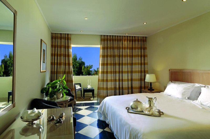 Camerele de la Out Of The Blue, Beach Resort sunt dotate cu aer condiționat, Tv cu canale prin satelit și seif. Fiecare cameră dispune de un aparat pentru preparare cafea sau ceai, cană-fierbător și minibar. Oaspeții pot solicita serviciul de room service pentru a servi masa sau diverse băuturi. Camerele au balcon cu vedere la mare, la piscină sau la grădină. Oaspeții au acces gratuit la serviciul Wi-fi în camere. În camere există baie cu cadă sau duș, foehn, articole de toaletă gratuite, precum și halate de baie și papuci. Curățenia in cameră se face zilnic. Proprietatea oferă camere pentru familie cu o suprafață mai mare și un număr mai mare de paturi față de cele standard.