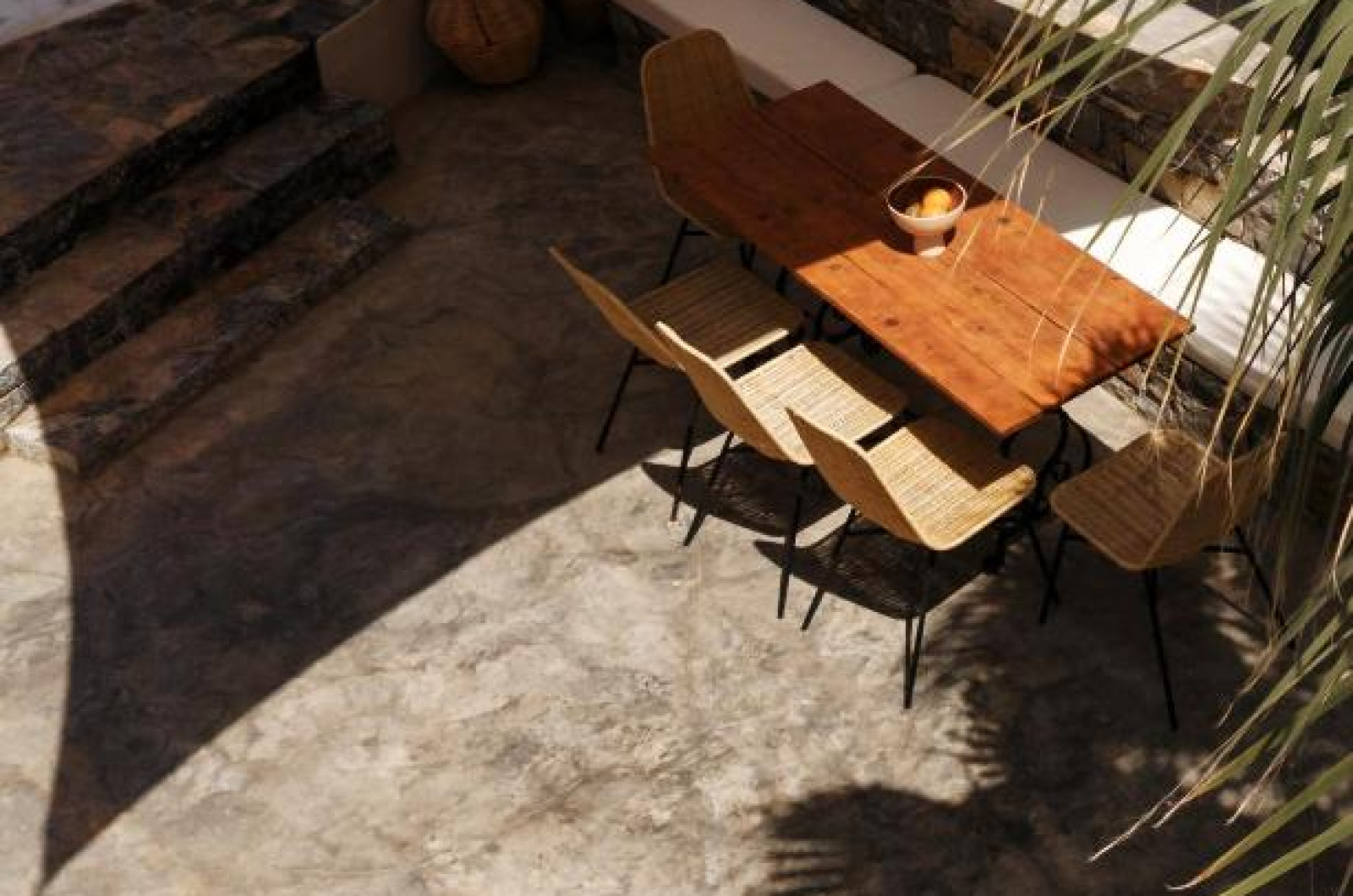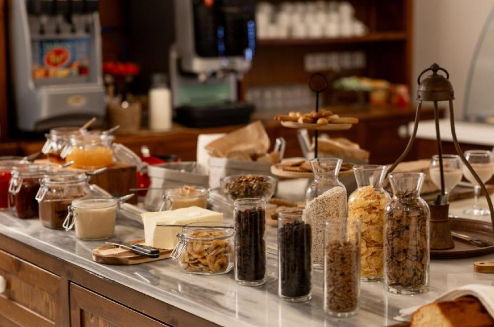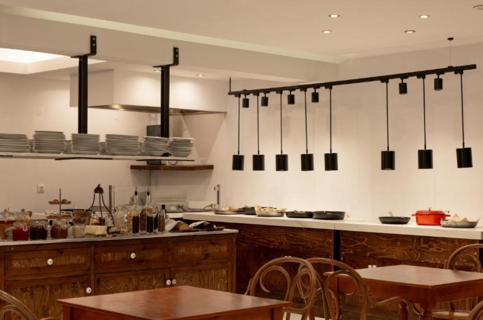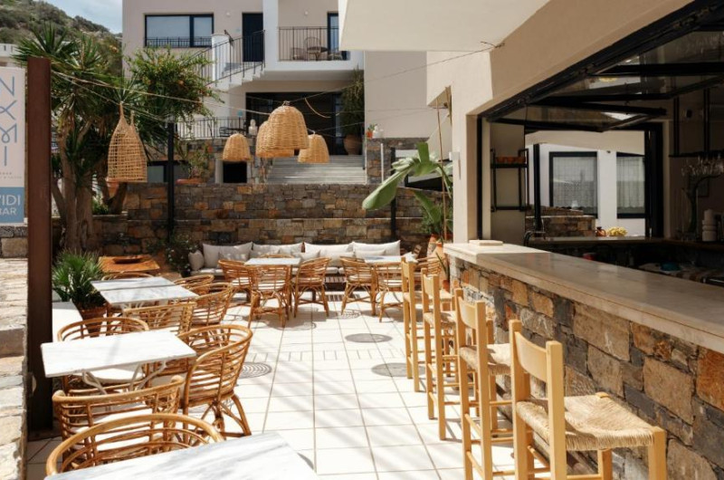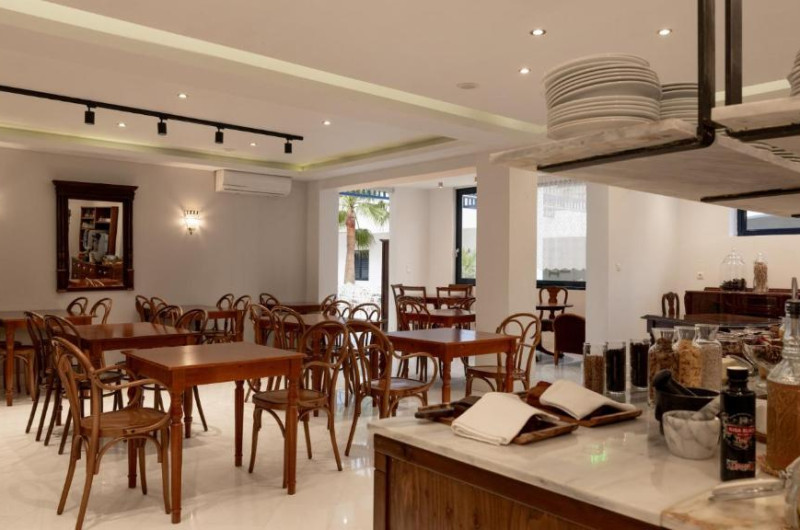 Restaurantul principal servește preparate din bucătăria grecească și internațională, iar barul de la terasă este locul perfect pentru un cocktail la apus. In imediata apropiere se găsesc numeroase taverne tradiționale grecești și magazine.