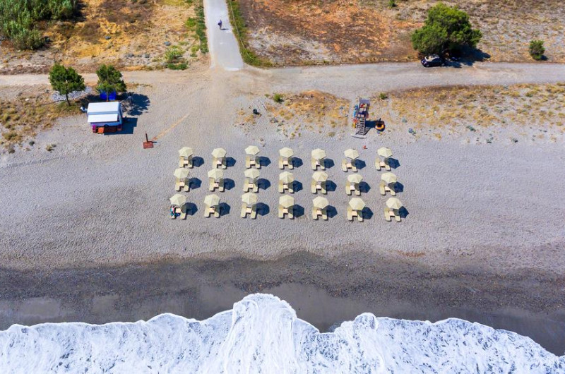 Solimar Aquamarine are în apropiere o plajă cu nisip. Pe plajă există șezlonguri și umbrele de plajă.
