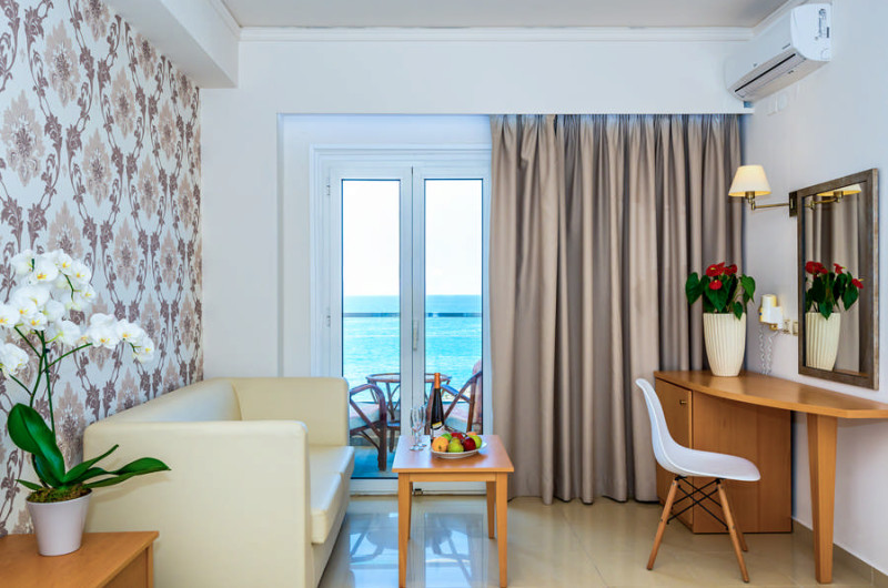 Sunt disponibile 158 camere. În camere există baie cu cadă sau duș prevăzută cu foehn. Un minibar și o mașină pentru preparare cafea sau ceai se află în fiecare cameră. Oaspeții pot solicita serviciul de room service pentru a servi masa sau diverse băuturi. Unele camere au balcon cu vedere la mare, unde oaspeții pot admira apusul sau răsăritul soarelui. Camerele luminoase de la Themis Beach sunt dotate cu aer condiționat și Tv cu canale prin satelit. Oaspeții au acces gratuit la serviciul Wi-fi în camere. Curățenia in cameră se face zilnic. Fiecare unitate de cazare are frigider.