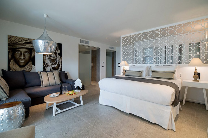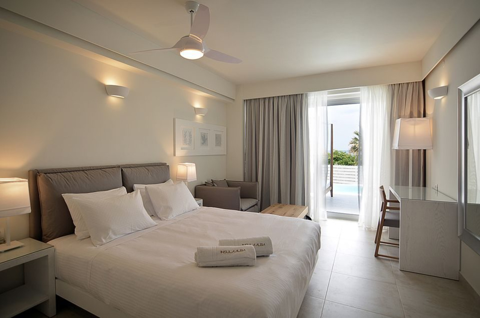 Sunt disponibile 182 camere. Camerele au balcon cu masă și scaune unde pot fi petrecute momente de relaxare. În camere există baie cu cadă sau duș, foehn, precum și halate de baie și papuci. Camerele de la Insula Alba Resort & Spa sunt dotate cu aer condiționat, Tv cu canale prin satelit și seif. Oaspeții au la dispoziție serviciul de room service pentru a servi masa sau diverse băuturi. Oaspeții au acces gratuit la serviciul Wi-fi în camere. Curățenia in cameră se face zilnic.