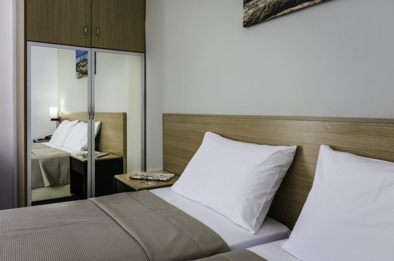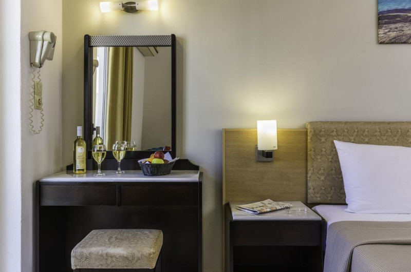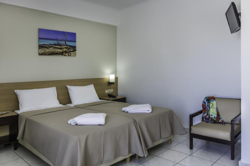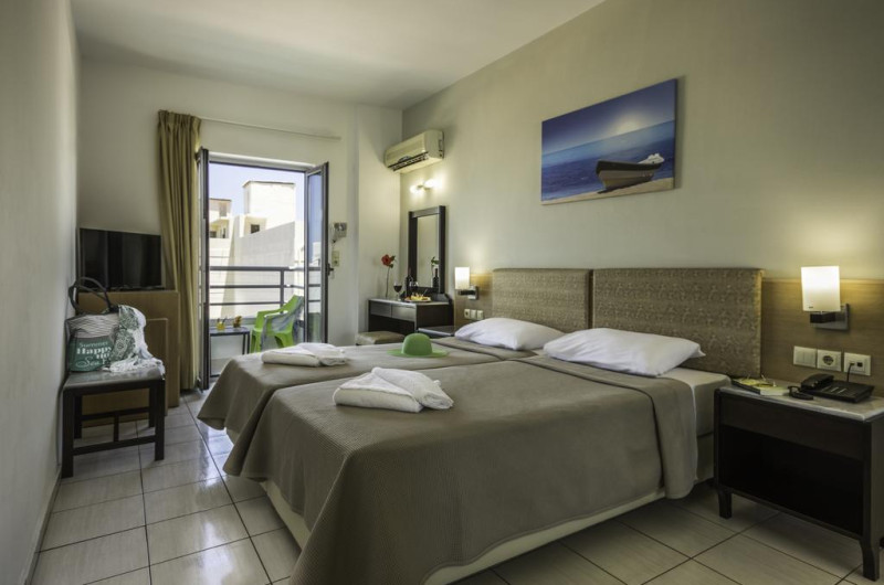 Camerele confortabile de la Sergios au pardoseală de gresie/ marmură, aer condiționat, Tv cu canale prin satelit și seif. În camere există baie cu cadă sau duș prevăzută cu foehn. Oaspeții au acces gratuit la serviciul Wi-fi în camere. Unele camere au balcon cu vedere la piscină. Curățenia in cameră se face zilnic. Proprietatea oferă camere pentru nefumători.