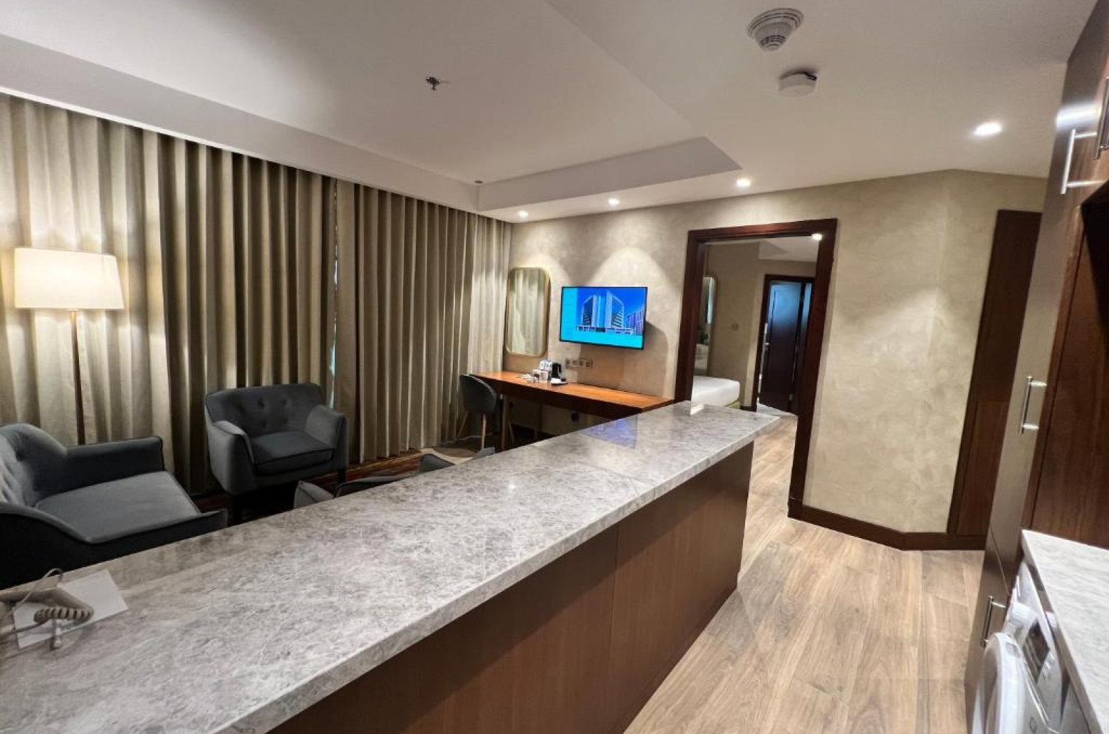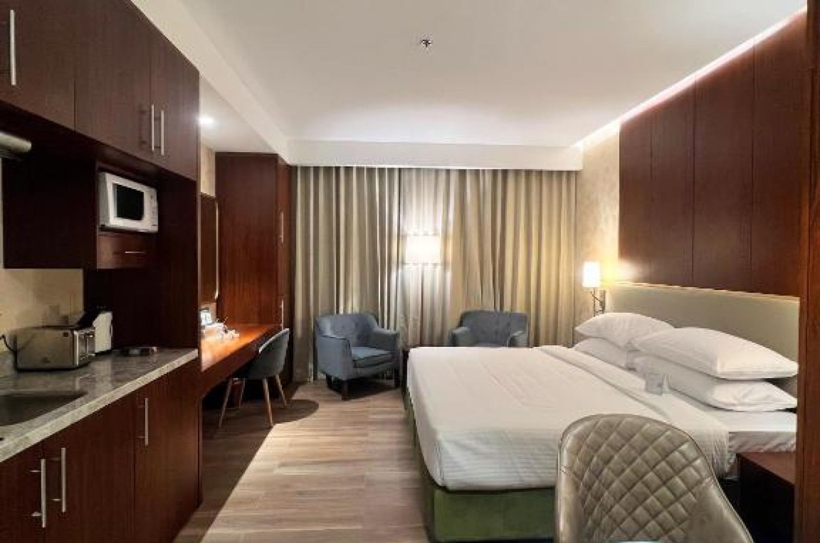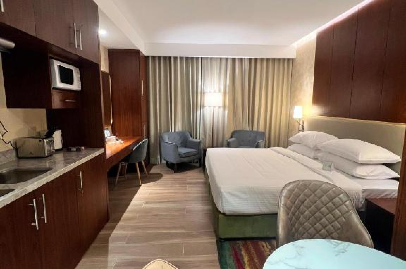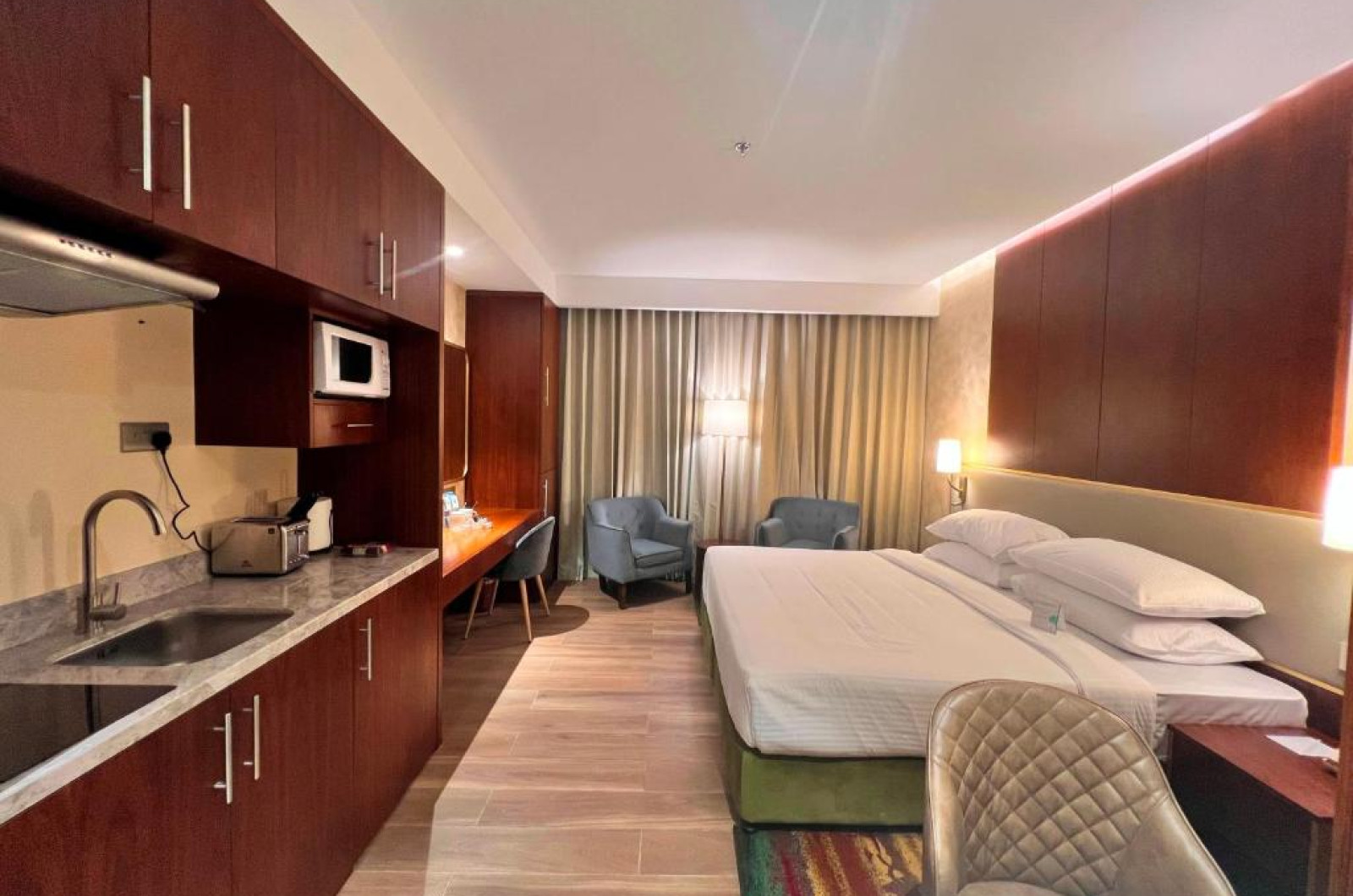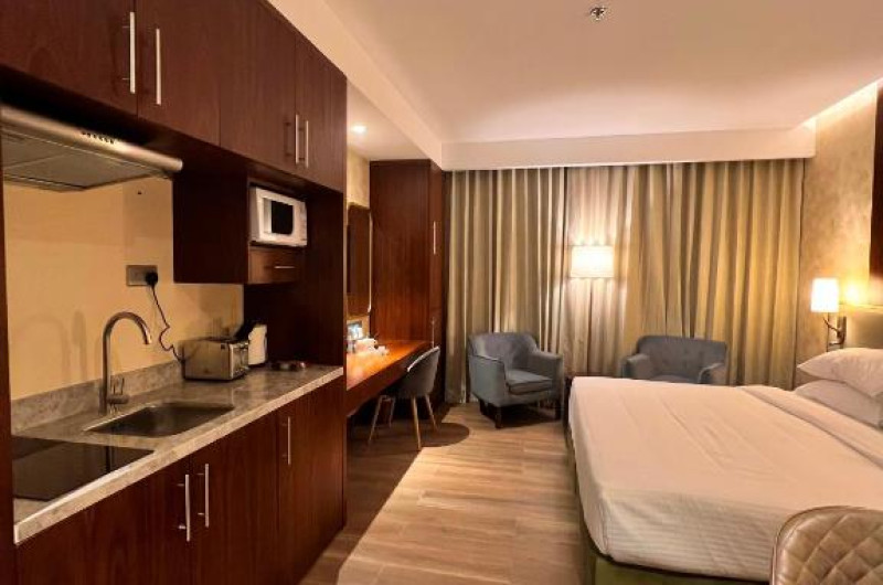 Apartamentele spațioase sunt dotate cu bucătărie complet utilată, living separat și zonă de dining, fiind ideale atat pentru familii, cat și pentru sejururi prelungite. Oaspeții se pot bucura de piscina de pe acoperiș cu vedere panoramică asupra orașului și de centrul de fitness modern.