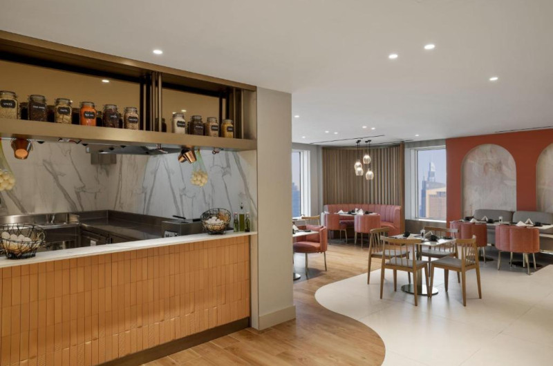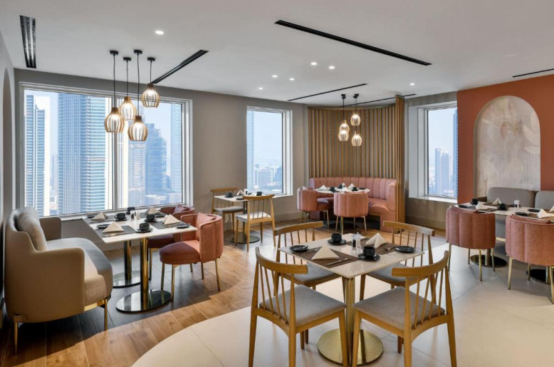 Situat la etajul 43, Restaurantul Panorama oferă vedere neintreruptă la Marea Arabiei și un meniu internațional variat. Delicatesele levantine autentice pot fi savurate la restaurantul libanez Tal Al Amar. Shisha este disponibilă in lounge-ul de pe acoperiș.
