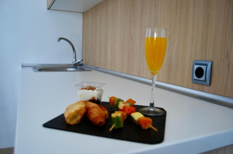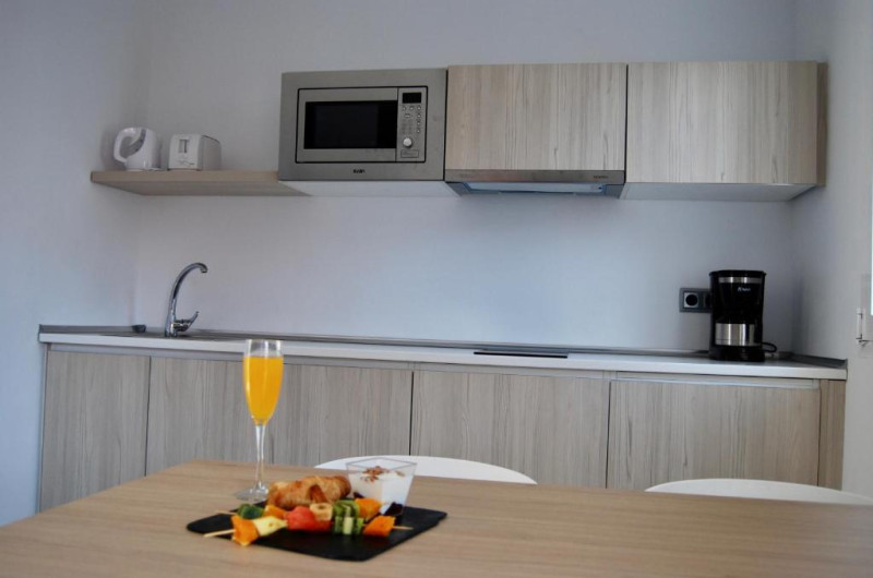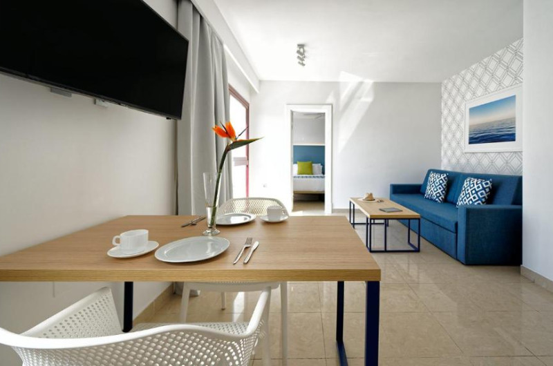 Fiecare apartament de la Broncemar Beach Suites are 1 dormitor, un balcon și o zonă de living-sufragerie. Chicineta include plită electrică, cuptor cu microunde și frigider.