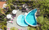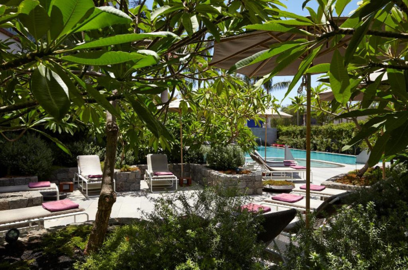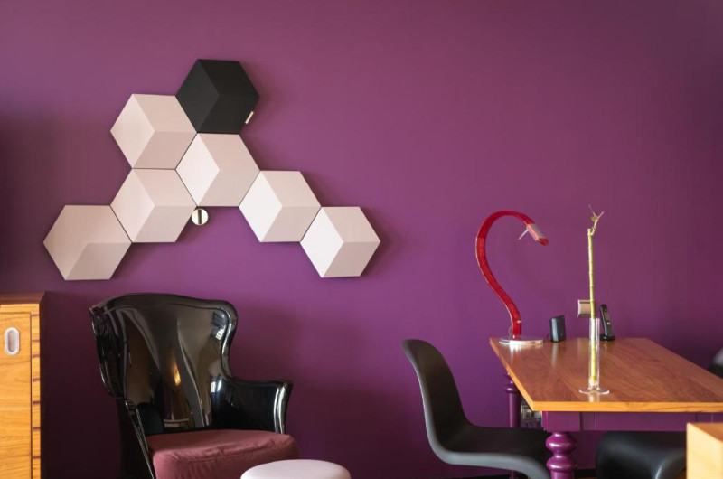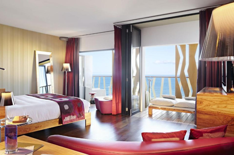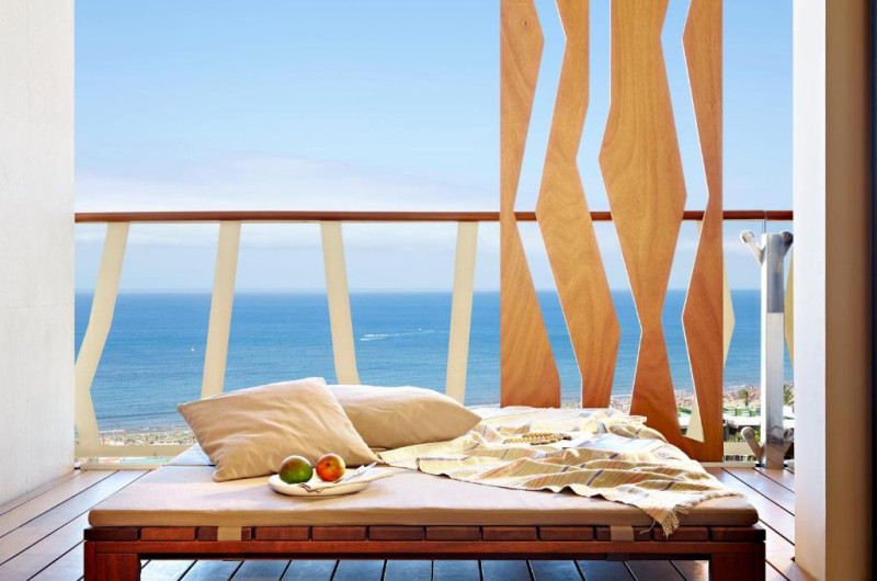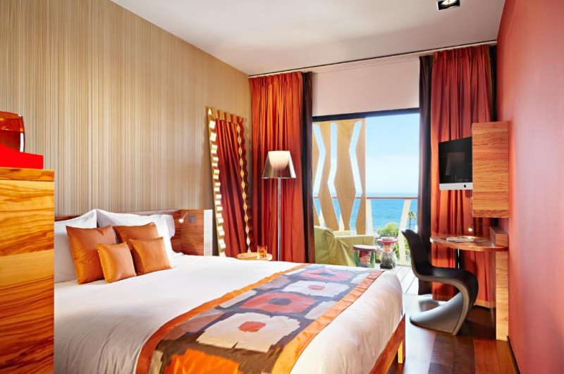Camerele elegante de la Bohemia Suites & Spa - Adults Only au culori galbene, teracotă sau violet, cu mobilier din lemn de măslin.