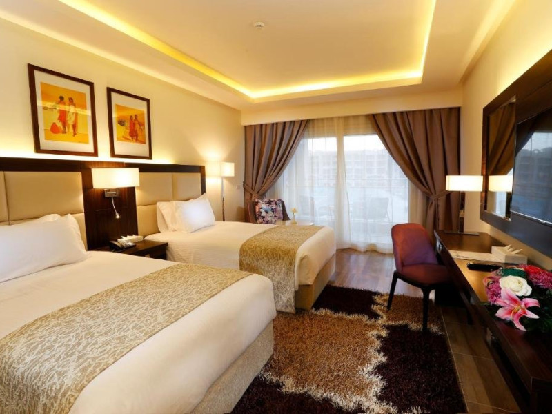 Localizare: Complexul hotelier este situat in statiunea Hurghada, pe plaja la Marea Rosie. Aeroportul International Hurghada este localizat la 3 km de hotel, iar Acvariul din Hurghada la 9 km.Dotari camera: Hotelul dispunde de 730 de camere dotate cu baie proprie cu dus si produse cosmetice de baie, uscator de par, aer conditionat, internet wi-fi, televizor LCD, minibar, balcon sau terasa cu mobilier si vedere la gradina hotelului, la piscine sau la mare.