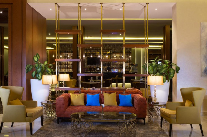 Facilitati: living separate de dormitor, minibar, seif, telefon, baie proprie cu dus uscator de par articole toaleta, TV cu ecran plat prin satelit, sistem de incalzire, ceainic, sifonier, prosoape, lenjerie, serviciu prosoape/ lenjerie contra cost, aer conditionat, ventilator, pardoseala gresie/ marmura, wake-up service
