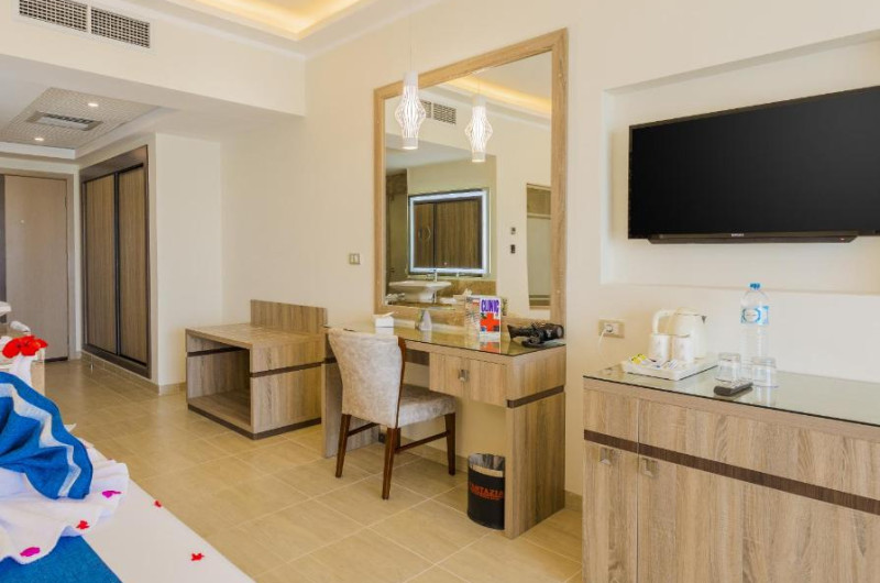 Camerele confortabile de la Fantazia Hotel au pardoseală de gresie/ marmură, aer condiționat, Tv cu canale prin satelit și seif. Fiecare cameră dispune de minibar. Oaspeții pot solicita serviciul de room service pentru a servi masa sau diverse băuturi. În camere există baie cu cadă sau duș, foehn, articole de toaletă gratuite, precum și halate de baie și papuci. Oaspeții au acces gratuit la serviciul Wi-fi în camere. Camerele au balcon cu vedere la mare sau la piscină. Curățenia in cameră se face zilnic. Proprietatea oferă camere pentru familie cu o suprafață mai mare și un număr mai mare de paturi față de cele standard.