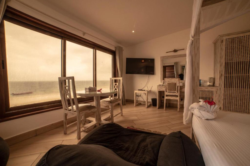 Apartamentele spațioase beneficiază de balcoane private cu vedere spre ocean, bucătării complet utilate și zone de living confortabile. Facilitățile complexului includ o piscină infinity cu vedere panoramică, restaurant cu specific local și internațional, precum și acces direct la plaja privată.