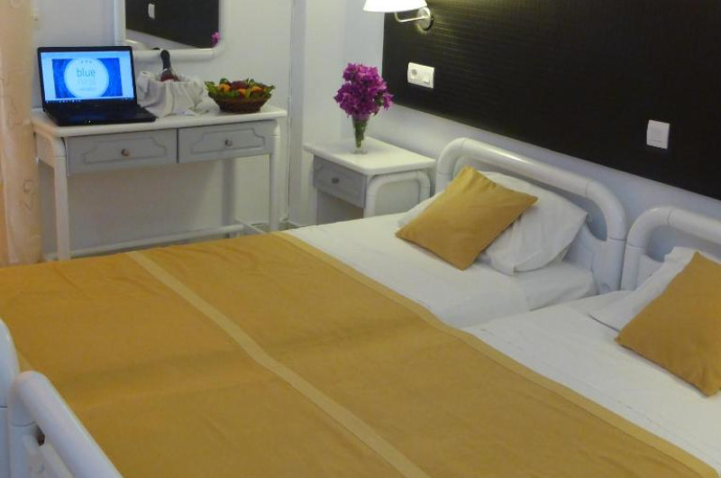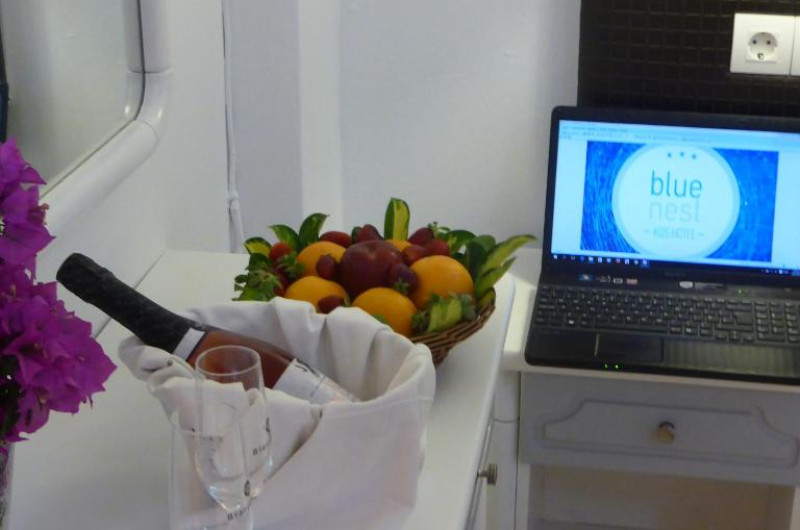 Hotelul Blue Nest, inconjurat de vegetație luxuriantă se află la 120 de metri de cea mai apropiată plajă și pune la dispoziție o zonă in aer liber și un restaurant. Oferă unități de cazare cu acces gratuit la conexiunea WiFi in toate zonele și balcon cu vedere la grădină sau la Marea Egee.