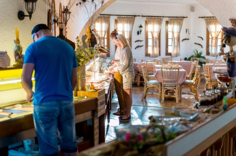La Gaia Garden oaspeții au la dispoziție un restaurant care servește mâncare în stil bufet. Preparate din bucătăria internațională, grecească și mediteraneană așteaptă să fie degustate în fiecare zi la micul dejun, prânz și cină. Masa poate fi servită atât în interior, cît si în aer liber, pe terasă, în funcție de vreme. 2 baruri, dintre care unul la piscină, sunt disponibile cu o ofertă variată de băuturi răcoritoare și alcoolice.