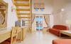 Dotari camere: Family Village dispune de 219 camere, inclusiv 21 apartamente, 24 maisonette si 54 camere family, toate amenajate elegant, in culori mediteraneene si cu vedere spre gradina sau mare. Toate camerele sunt dotate cu aer conditionat, telefon, frigider, balcon/terasa, seif (contra cost), kitchenette (in majoritatea studiourilor si apartamentelor).