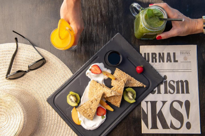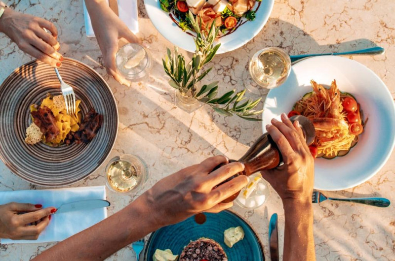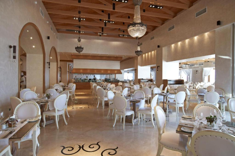 Restaurantul principal servește mic dejun tip bufet american și mic dejun continental devreme, precum și pranz și cină. Toate mesele sunt servite in stil bufet cu bucătărie deschisă. In fiecare seară, oaspeții au posibilitatea de a gusta specialități din bucătăria grecească și internațională, precum specialități italiene, panasiatice și Tex-Mex. Sushi, Ouzeri Burger Inn, Healthy Corner, Pita Corner, pită tradițională și un colț de patiserie sunt, de asemenea, disponibile la proprietate.