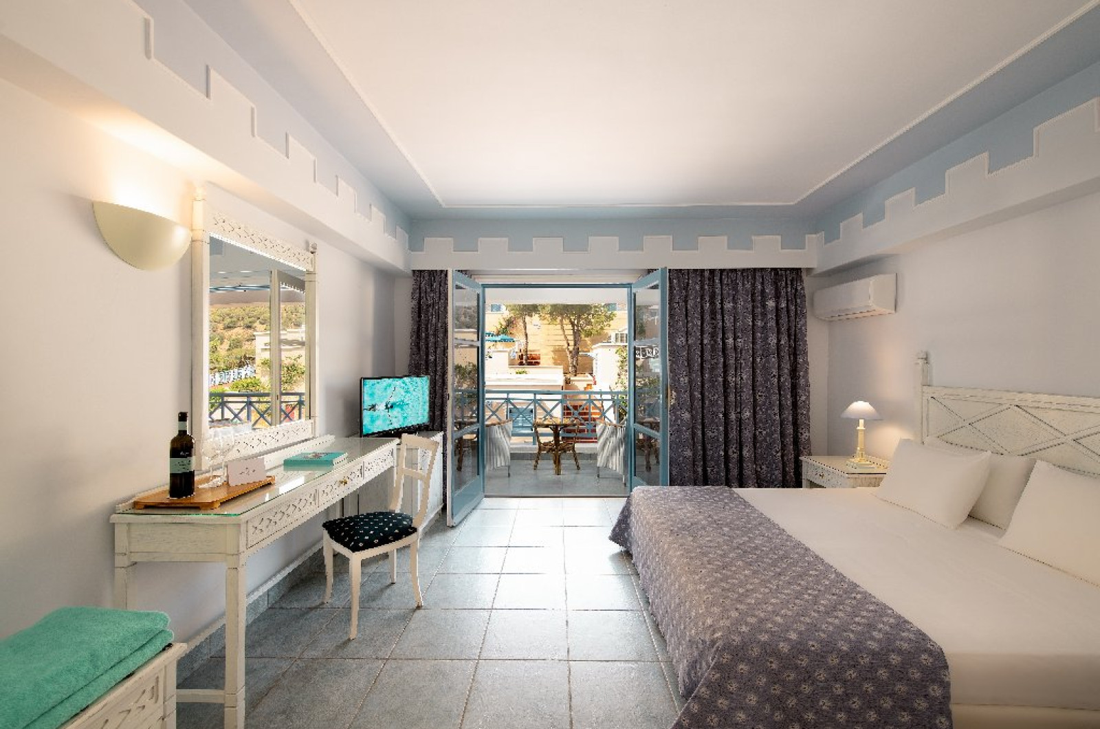 Dotari camere: Camerele sunt decorate in nuante de albastru si sunt dotate cu aer conditionat, uscator de par, mini frigider, televizor, balcon/terasa, seif (contra cost).