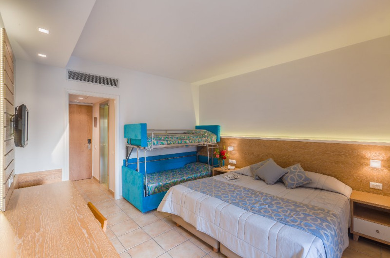 Dotari camere: camerele sunt echipate cu telefon, uscator de par, televizor, frigider, balcon/terasa, aer conditionat centralizat (15/06-15/09, interval orar ales de hotel). Pentru familiile cu 2 adulti si 2 copii se va aloca un pat supraetajat pentru copii.
