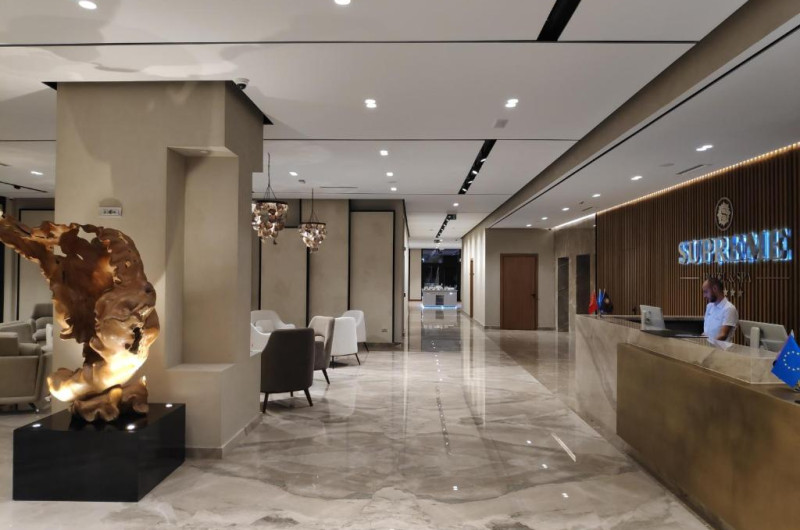 Supreme Hotel se află in Golem, la cațiva pași de Plaja Qerret, și pune la dispoziție o zonă in aer liber sezonieră, o grădină, un lounge comun și parcare privată gratuită. Printre facilități disponibile la această proprietate se numără un restaurant, o recepție deschisă nonstop și un serviciu de concierge, precum și WiFi gratuit in intreaga proprietate. Anumite unități de proprietate includ un balcon cu o vedere la mare.