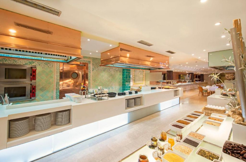 Complexul impresionează prin cele 6 piscine, inclusiv zone dedicate copiilor, și prin grădinile sale luxuriante care creează o atmosferă relaxantă. Oaspeții au la dispoziție 4 restaurante care servesc specialități mediteraneene și internaționale, precum și programe de entertainment pentru toate varstele.