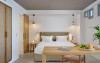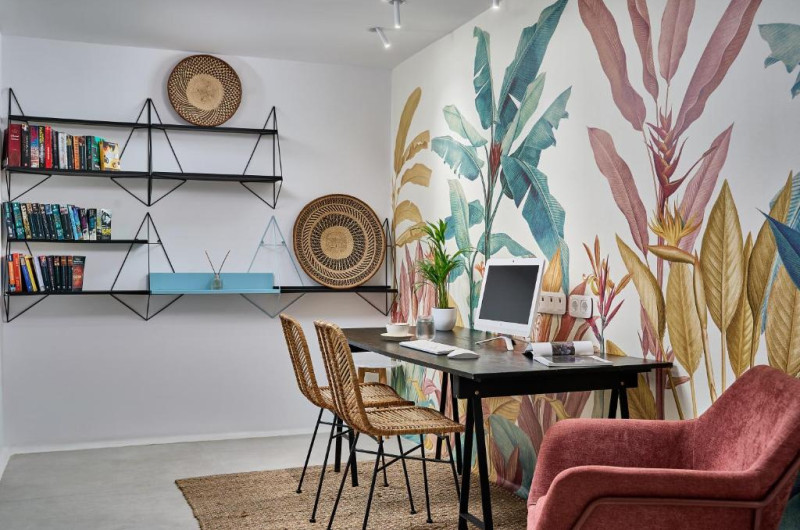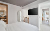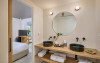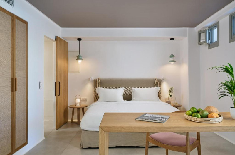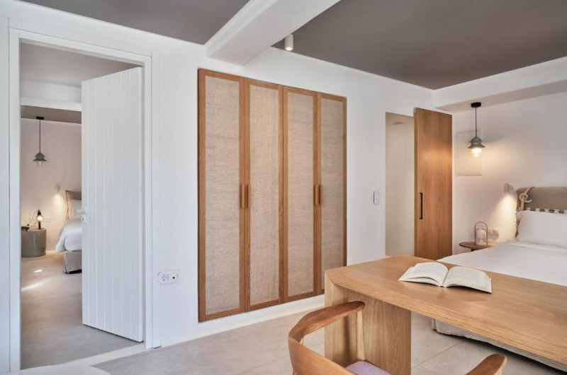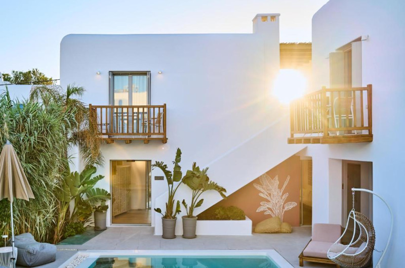 Proprietatea combină stilul cicladic cu infuziile de decor boem elegant, avand pereți văruiți in alb tradițional, pergole din lemn și obloane in culori pastelate.