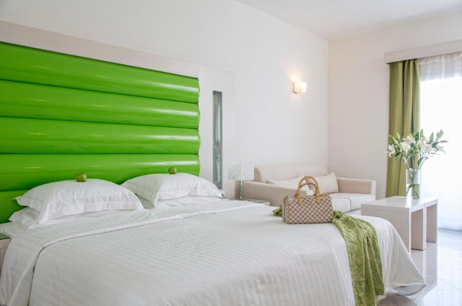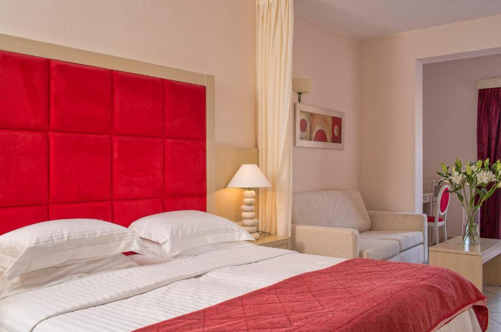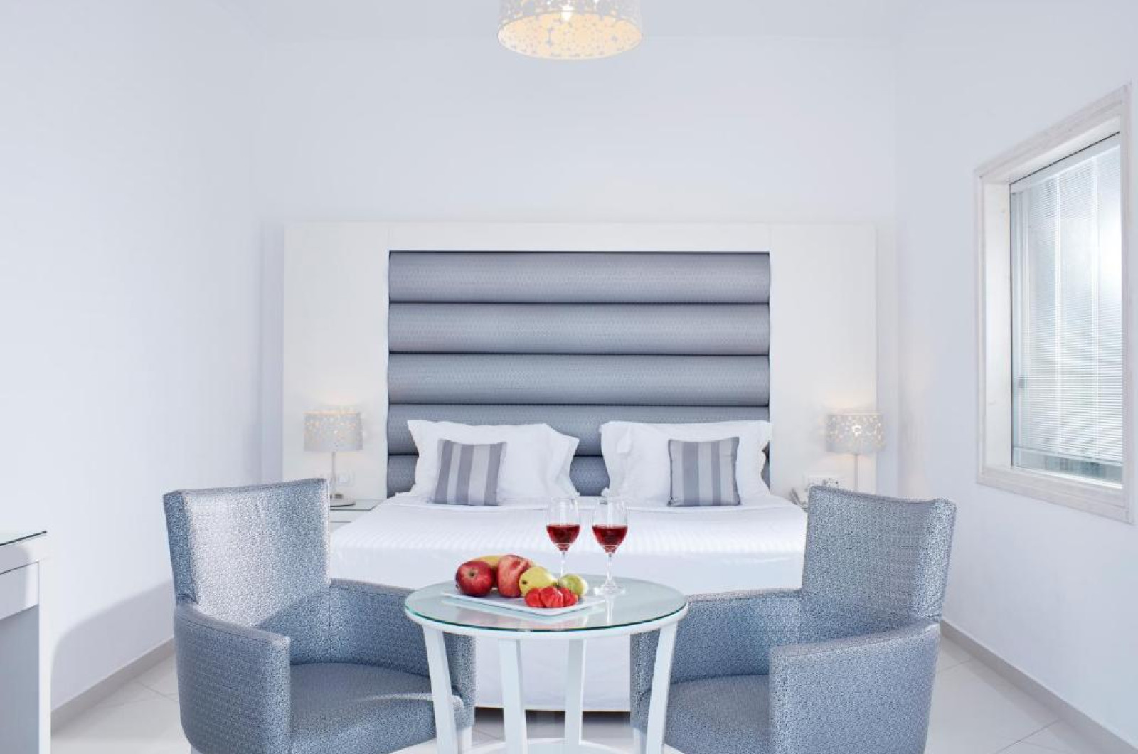 Camerele confortabile de la Grand Beach au pardoseală de gresie/ marmură, aer condiționat, Tv cu canale prin satelit și seif. Fiecare cameră dispune de minibar și cană-fierbător. Oaspeții pot solicita serviciul de room service pentru a servi masa sau diverse băuturi. Camerele au balcon cu vedere la mare sau la piscină. Oaspeții au acces gratuit la serviciul Wi-fi în camere. În camere există baie cu cadă sau duș, foehn, articole de toaletă gratuite, precum și halate de baie și papuci. Curățenia in cameră se face zilnic.