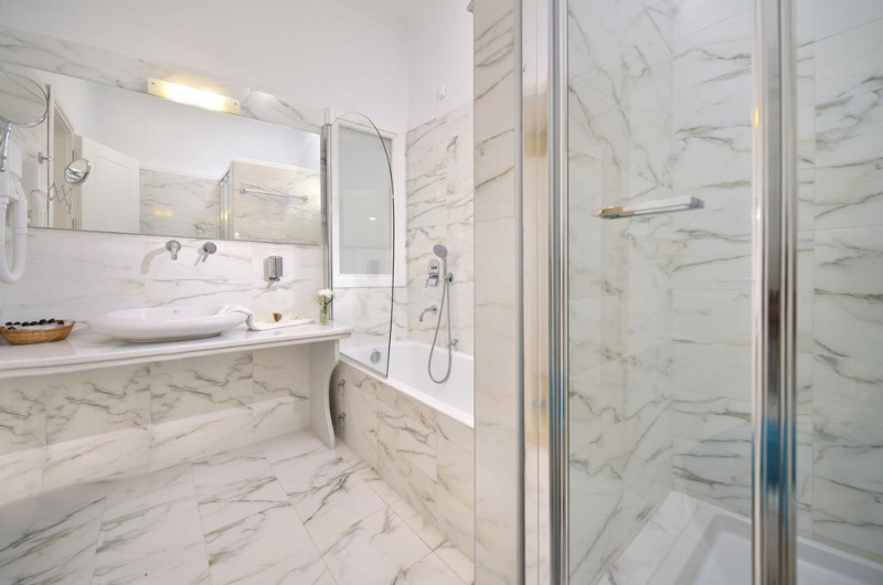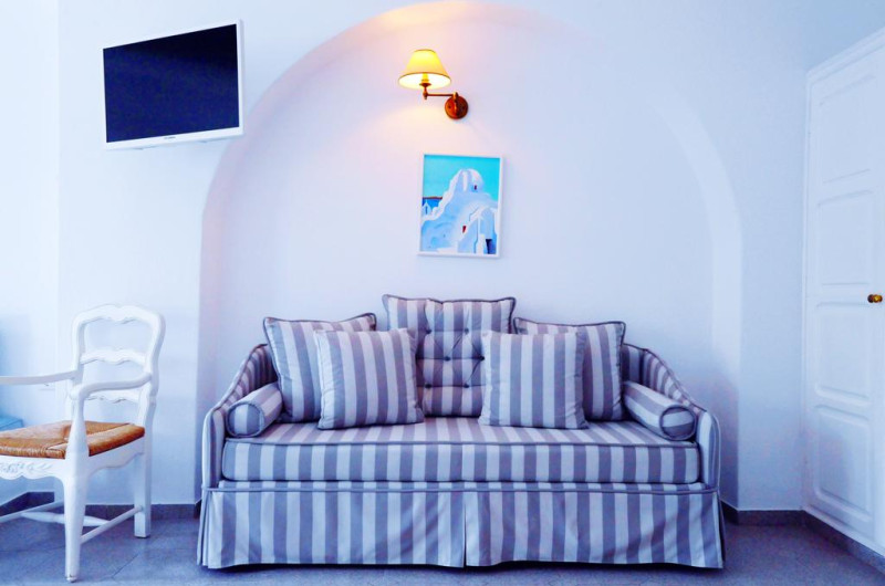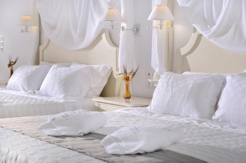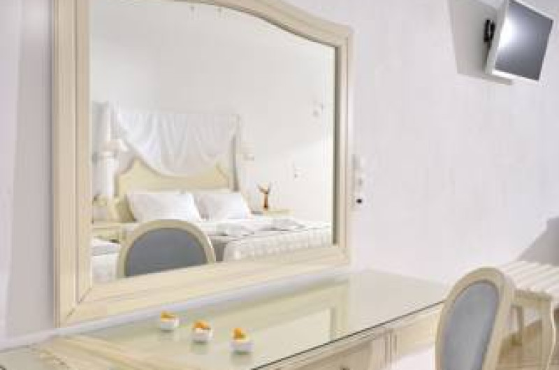În camere există baie cu cadă sau duș prevăzută cu foehn. Fiecare cameră dispune de cană-fierbător. Camerele confortabile de la Kamari au pardoseală de gresie/ marmură, aer condiționat, Tv cu canale prin satelit și seif. Unele camere au balcon cu vedere la mare sau la piscină. Oaspeții au acces gratuit la serviciul Wi-fi în camere. Proprietatea oferă camere pentru familie cu o suprafață mai mare și un număr mai mare de paturi față de cele standard.