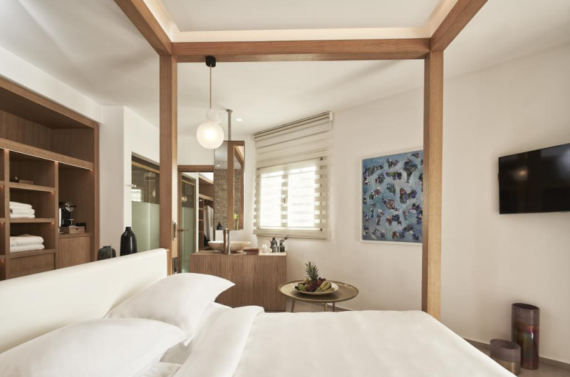 Sunt disponibile 18 camere. Camerele luminoase de la Myconian Naia sunt dotate cu aer condiționat și Tv cu canale prin satelit. Unele camere au balcon cu vedere la mare, unde oaspeții pot admira apusul sau răsăritul soarelui. Un minibar și o mașină pentru preparare cafea sau ceai se află în fiecare cameră. Oaspeții pot solicita serviciul de room service pentru a servi masa sau diverse băuturi. În camere există baie cu cadă sau duș, foehn, precum și halate de baie și papuci. Oaspeții au acces gratuit la serviciul Wi-fi în camere. Curățenia in cameră se face zilnic.