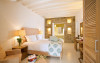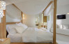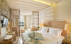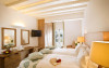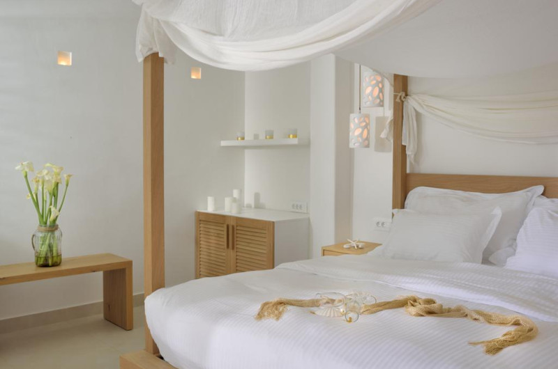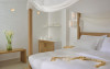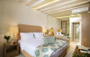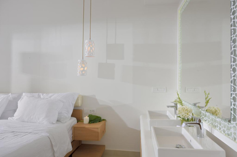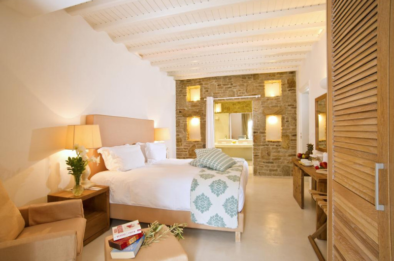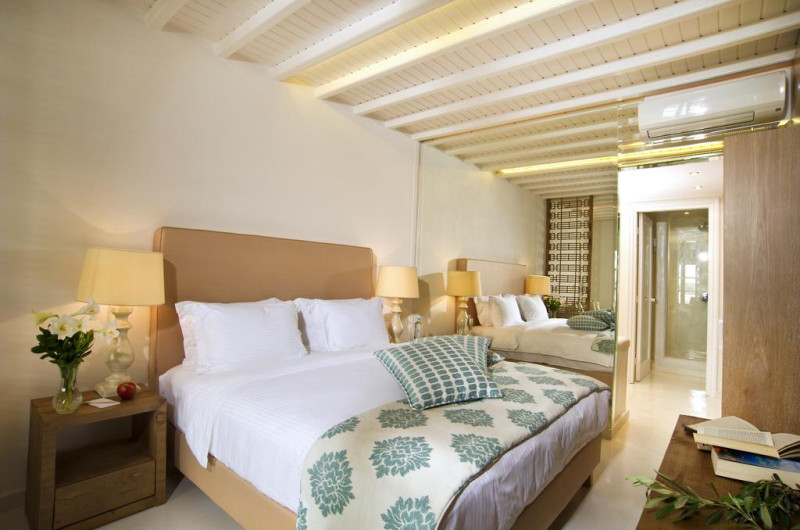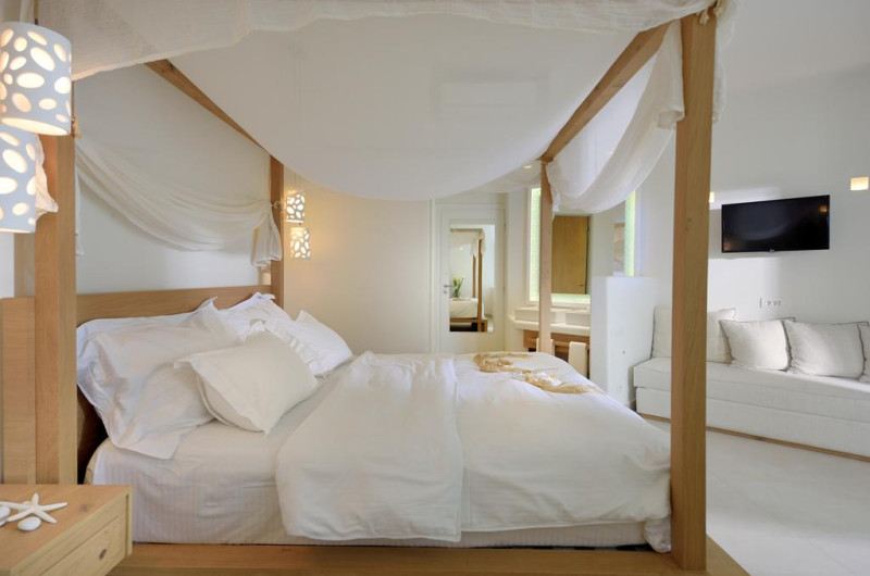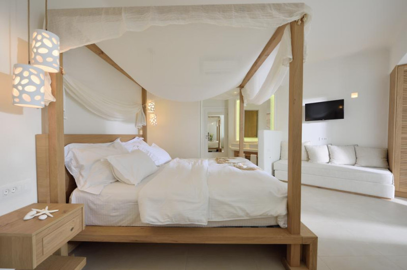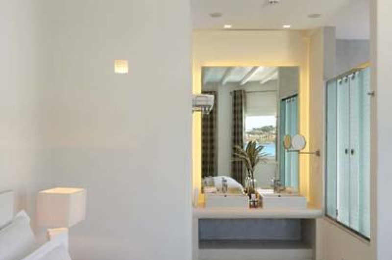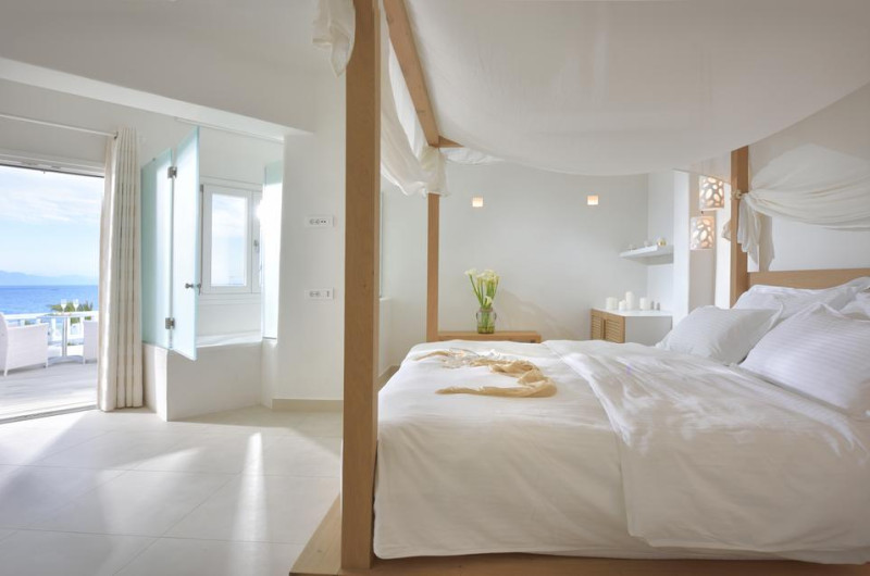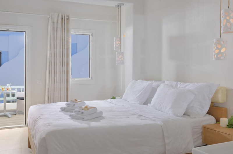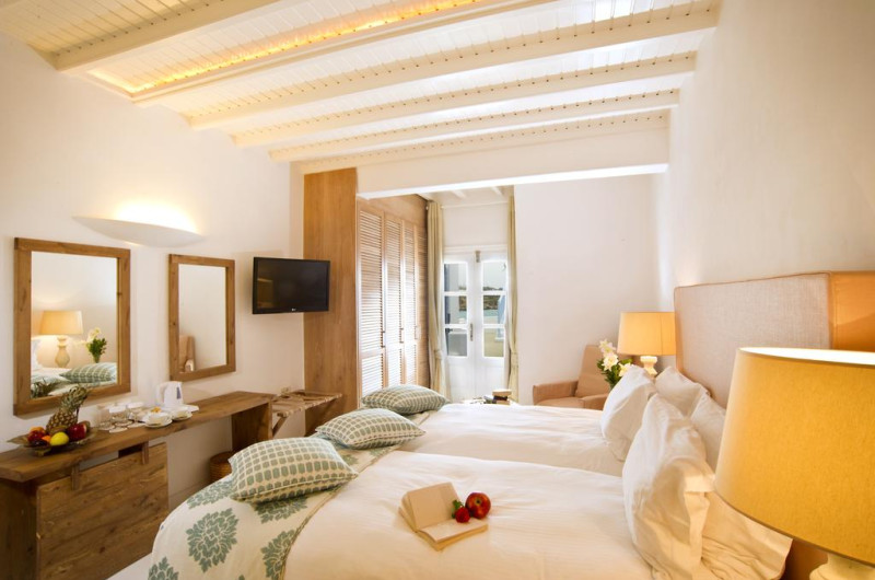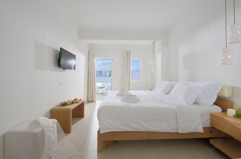 Camerele de la Petinos Beach sunt dotate cu aer condiționat, Tv cu canale prin satelit și seif. În camere există baie cu cadă sau duș ce are în dotare foehn și articole de toaletă gratuite. Fiecare cameră dispune de minibar. Oaspeții pot solicita serviciul de room service pentru a servi masa sau diverse băuturi. Unele camere au balcon cu vedere la mare, unde oaspeții pot admira apusul sau răsăritul soarelui. Oaspeții au acces gratuit la serviciul Wi-fi în camere. Curățenia in cameră se face zilnic. Anumite camere au cadă cu hidromasaj care asigură un plus de confort și răsfăț. Proprietatea oferă camere pentru familie cu o suprafață mai mare și un număr mai mare de paturi față de cele standard.