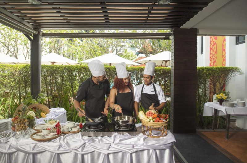 Palm Court beneficiază de o curte umbrită si zonă de luat masa in interior și oferă bufet cu preparate internaționale si cine tematice. De asemenea, există 2 baruri, iar serviciul de room service este disponibil intre orele 06:30 și 23:30.