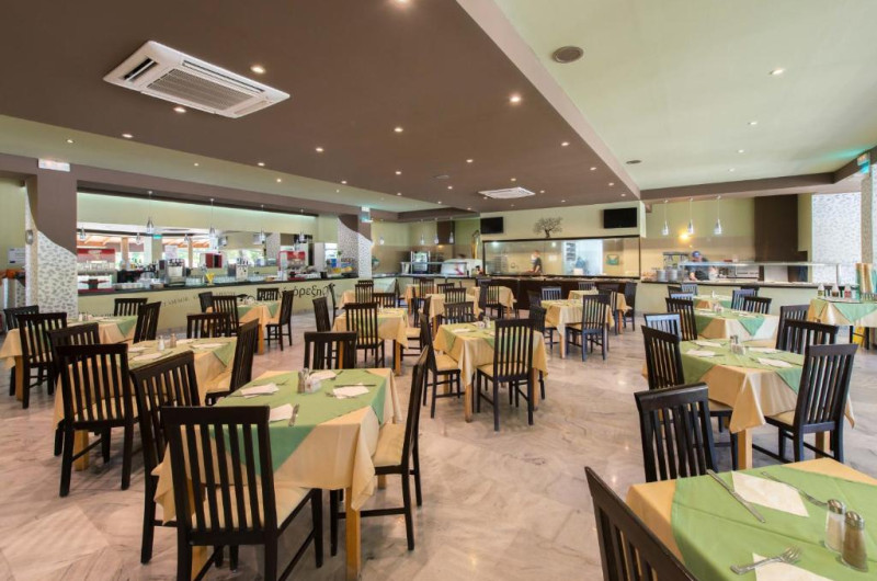 La Delfinia Resort oaspeții au la dispoziție un restaurant care servește mâncare în stil bufet. Preparate din bucătăria internațională, grecească și mediteraneană așteaptă să fie degustate în fiecare zi la micul dejun, prânz și cină. Masa poate fi servită atât în interior, cît si în aer liber, pe terasă, în funcție de vreme. Oaspeţii pot avea diverse băuturi răcoritoare sau alcoolice la bar. În cadrul proprietății există și un snack bar care servește băuturi și gustări. Pentru cei cu anumite nevoi de nutriție, Delfinia Resort oferă meniuri pentru diete speciale.