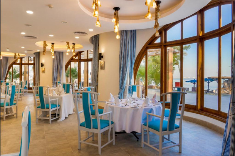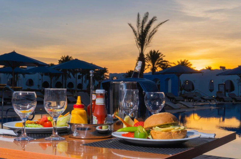 Safir Dahab Resort فندق سفير دهب oferă o varietate de opțiuni de luat masa internaționale. Restaurantul Flavours oferă mic dejun și cine tematice tip bufet, in timp ce restaurantul Catch Sea Food servește fructe de mare proaspete și restaurantul italian Portofino. Există, de asemenea, un bar pe plajă, un bar la piscină, Wi-Fi de 1 MB in toate camerele și punctele de vanzare.