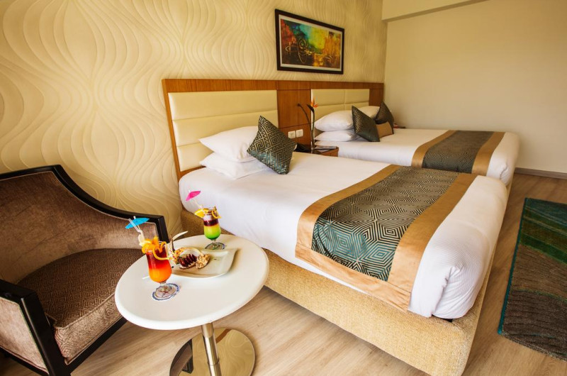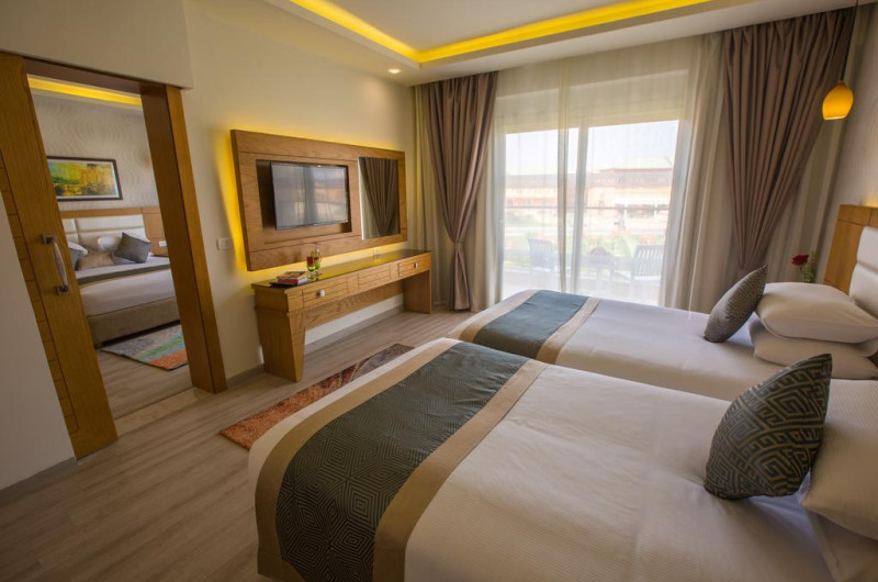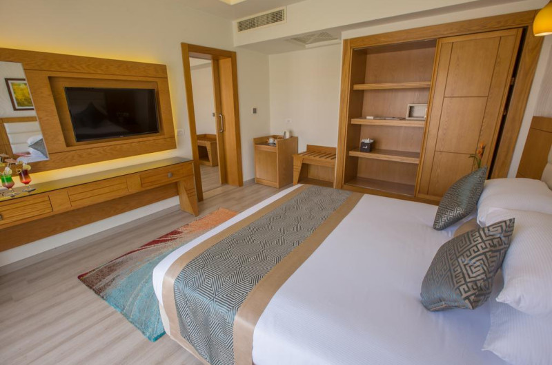 Sunt disponibile 538 camere. Camerele confortabile de la Aqua Blu Resort au pardoseală de gresie/ marmură, aer condiționat, Tv cu canale prin satelit și seif. Fiecare cameră dispune de minibar și cană-fierbător. Oaspeții pot solicita serviciul de room service pentru a servi masa sau diverse băuturi. Unele camere au balcon cu vedere la grădină sau la piscină. În camere există baie cu cadă sau duș ce are în dotare foehn și articole de toaletă gratuite. Oaspeții au acces gratuit la serviciul Wi-fi în camere. Curățenia in cameră se face zilnic. Toate camerele spațioase de la Aqua Blu Resort au zonă de relaxare cu canapea, ceea ce oferă un plus de confort. Proprietatea oferă camere pentru familie cu o suprafață mai mare și un număr mai mare de paturi față de cele standard. Se pot rezerva de asemenea camere pentru nefumători.