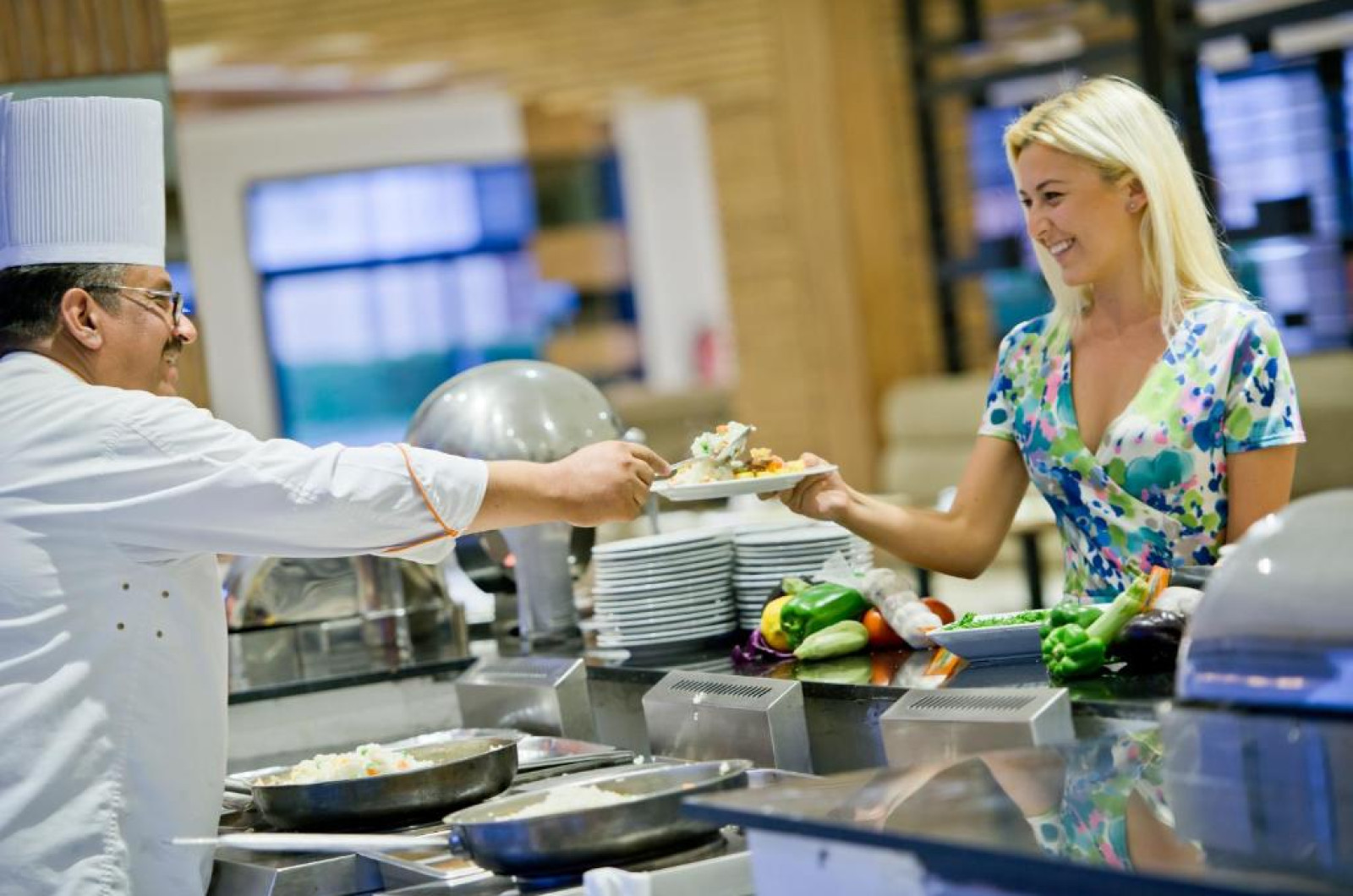 De la răsăritul soarelui pană tarziu in noapte, vă puteți bucura de o abundență de experiențe culinare. Bufeturile zilnice de la restaurantul Amphoras sunt completate de cine à la carte nelimitate la Bella Vista, Red Dragon și Mermaid. O experiență gratuită la Mare Rosso (Amphoras Blu) sau Alexandrina (Amphoras Aqua) adaugă o notă specială o dată pe sejur. Pe parcursul zilei, nouă baruri răspandite in complex servesc o gamă largă de băuturi locale și importate premium, inclusiv cocktailuri, vin, bere, sucuri proaspete, băuturi răcoritoare și băuturi calde. Gustări, inghețată și delicii proaspăt coapte sunt oferite la diverse puncte de vanzare pentru a vă menține satisfăcuți la orice oră. Cafeneaua Layalina oferă un spațiu confortabil unde vă puteți bucura de narghilea gratuită, gustări tradiționale egiptene, băuturi calde și reci și cocktailuri locale pană in zori.