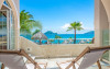 Pe plajă există șezlonguri și umbrele de plajă.