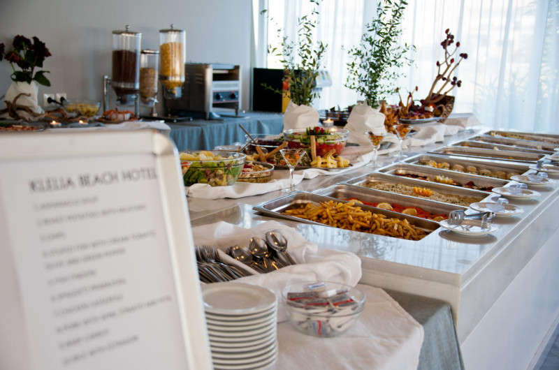 La Klelia Beach oaspeții au la dispoziție un restaurant care servește mâncare în stil bufet și à la carte. Preparate din bucătăria internațională, grecească și mediteraneană așteaptă să fie degustate în fiecare zi la micul dejun, prânz și cină. Masa poate fi servită atât în interior, cît si în aer liber, pe terasă, în funcție de vreme. Klelia Beach servește zilnic un mic dejun tip bufet în zona de luat masa. Oaspeţii pot avea diverse băuturi răcoritoare sau alcoolice la bar. În cadrul proprietății există și un snack bar care servește băuturi și gustări. Pentru cei cu anumite nevoi de nutriție, Klelia Beach oferă meniuri pentru diete speciale.