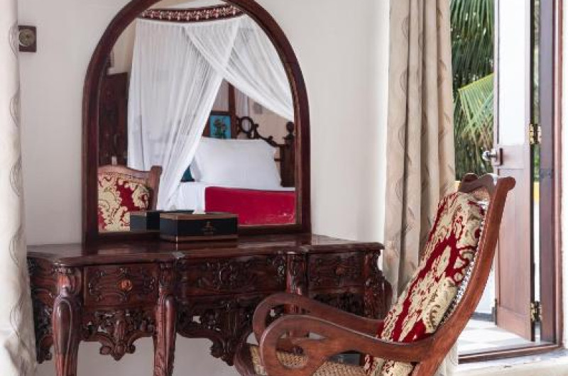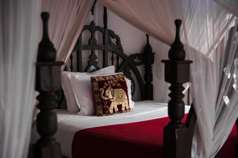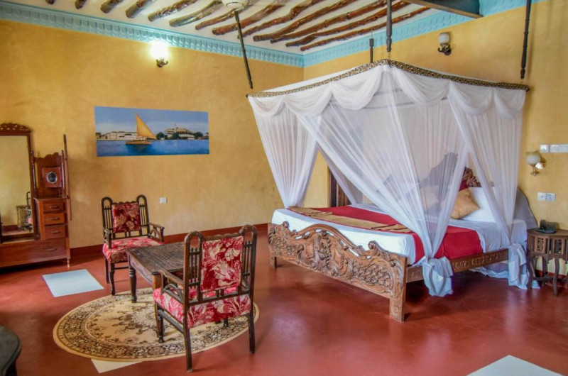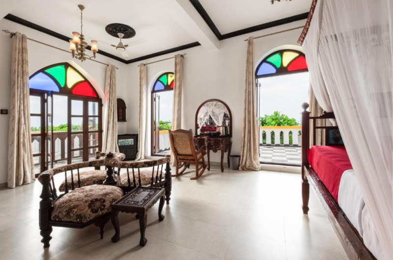 Fiecare cameră este decorată cu mobilier din lemn sculptat, avand pat cu baldachin Swahili, zonă de relaxare cu TV, aer condiționat și baie cu duș și hamam tradițional. Majoritatea camerelor au balcon cu vedere la mare sau la piscină.