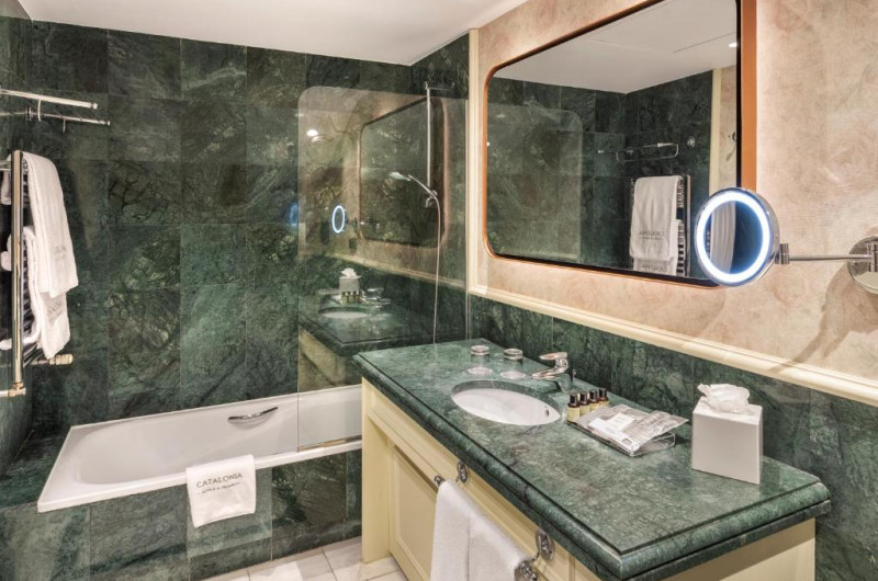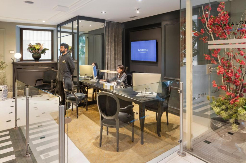 Toate camerele din Catalonia Las Cortes au decor clasic și TV cu ecran plat cu canale prin satelit. Camerele și suitele superioare impresionante au mobilier de epocă și fresce autentice pe tavan. Oaspeții vor găsi, de asemenea, un aparat de cafea Nespresso® și un fierbător de apă in camere, precum și o sticlă de apă de bun venit din partea casei. Toate camerele de hotel au televizoare inteligente, care sunt echipate cu aplicația Chromecast.