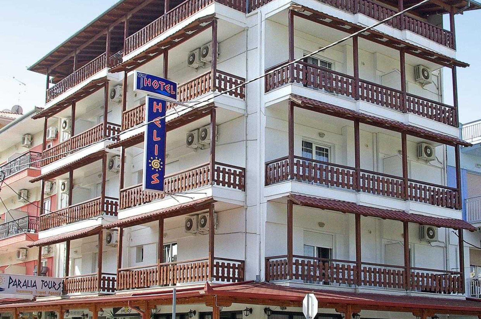 Hotelul Helios este situat în centrul orașului, în apropierea tavernelor Nautilos, Molos Fish Resto și Struga, cafenelelor, magazinelor de suveniruri și la aproximativ 50 m de plaja publica (umbrele si sezlonguri gratuite, consumatia la bar fiind obligatorie). Plaja din Paralia este cu nisip, fara pietricele,iar apele Marii Egee sunt calde si curate.