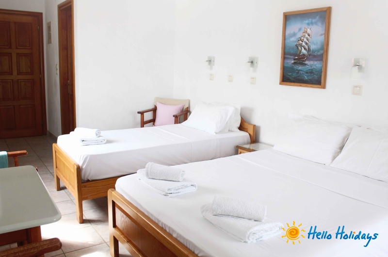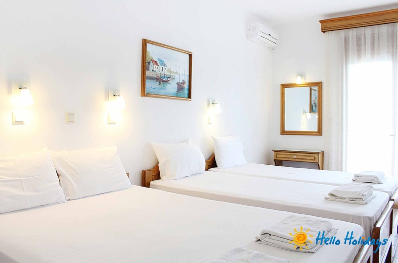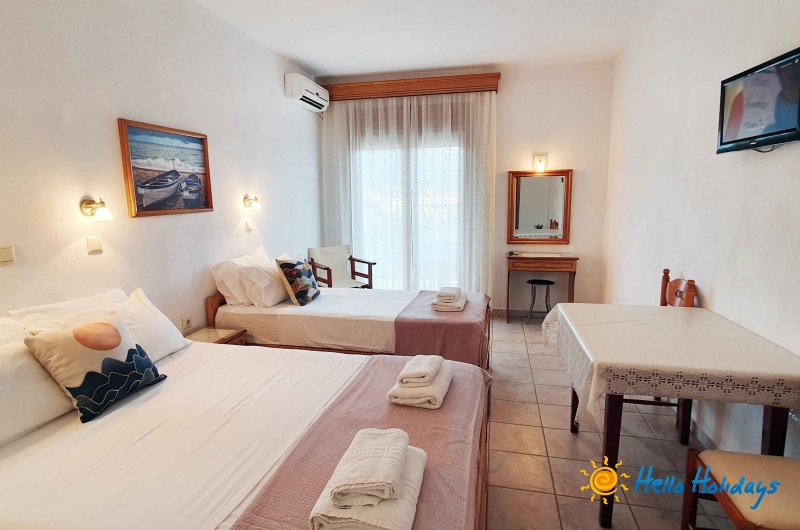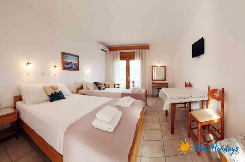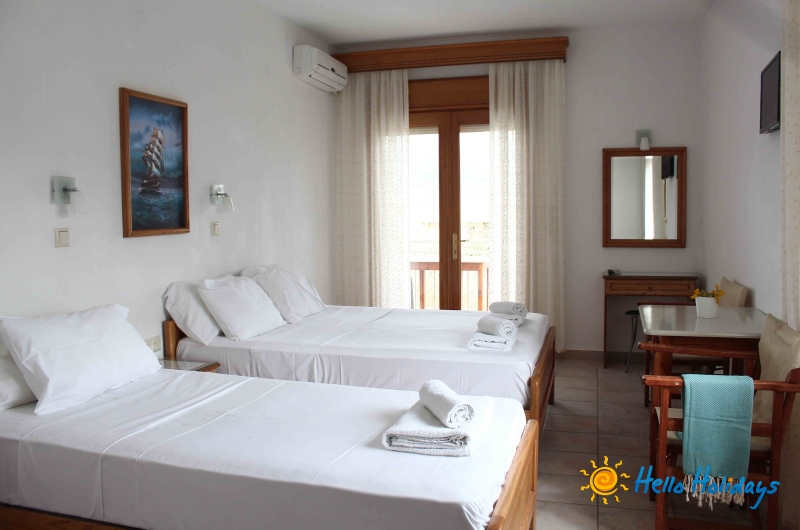 Camerele de la Mesimvria sunt frumos amenajate si sunt dotate cu chicineta complet utilata, hota, grup sanitar cu dus, uscator de par, balcon/terasa cu obloane, TV LCD, frigider, prosoape, AC contra cost (7€/zi/camera – se achita la receptie la check in), Internet Wi-Fi GRATUIT.