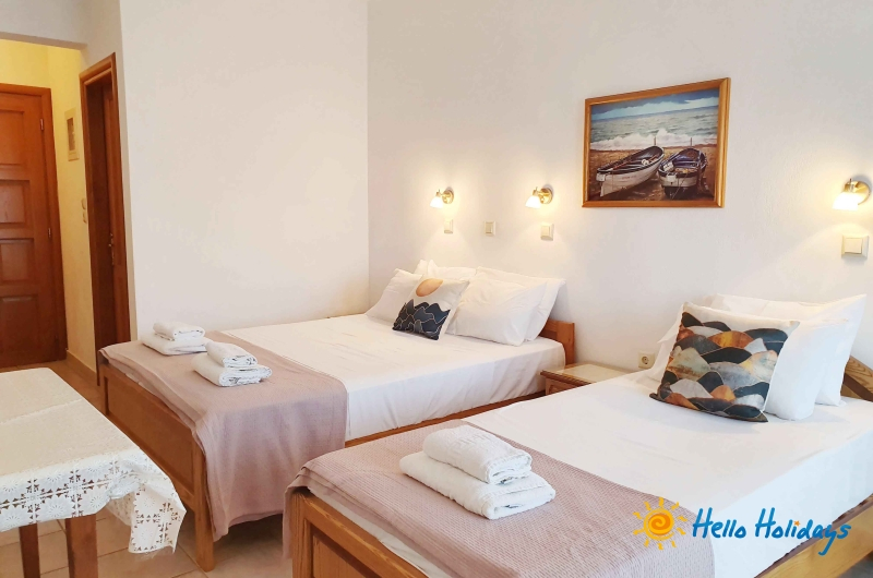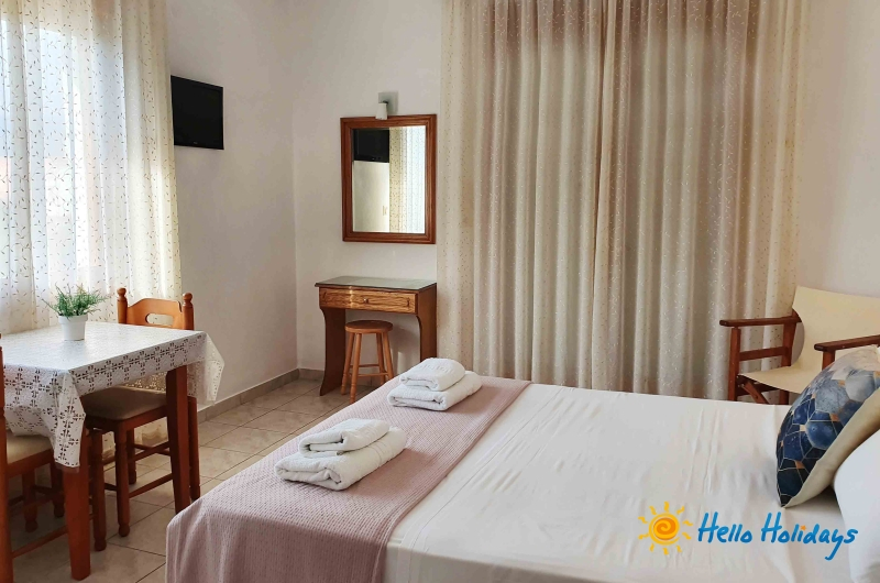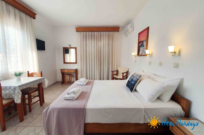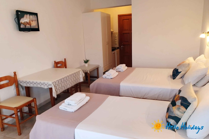 Studio Mesimvria, modern construita in anul 2010, isi intampina turistii cu o ambianta specific greceasca, oferind liniste si confort oaspetilor sai. Unitatea de cazare este o afacere de familie si asigura pentru turisti o gazda intotdeauna prezenta si servicii de foarte buna calitate.