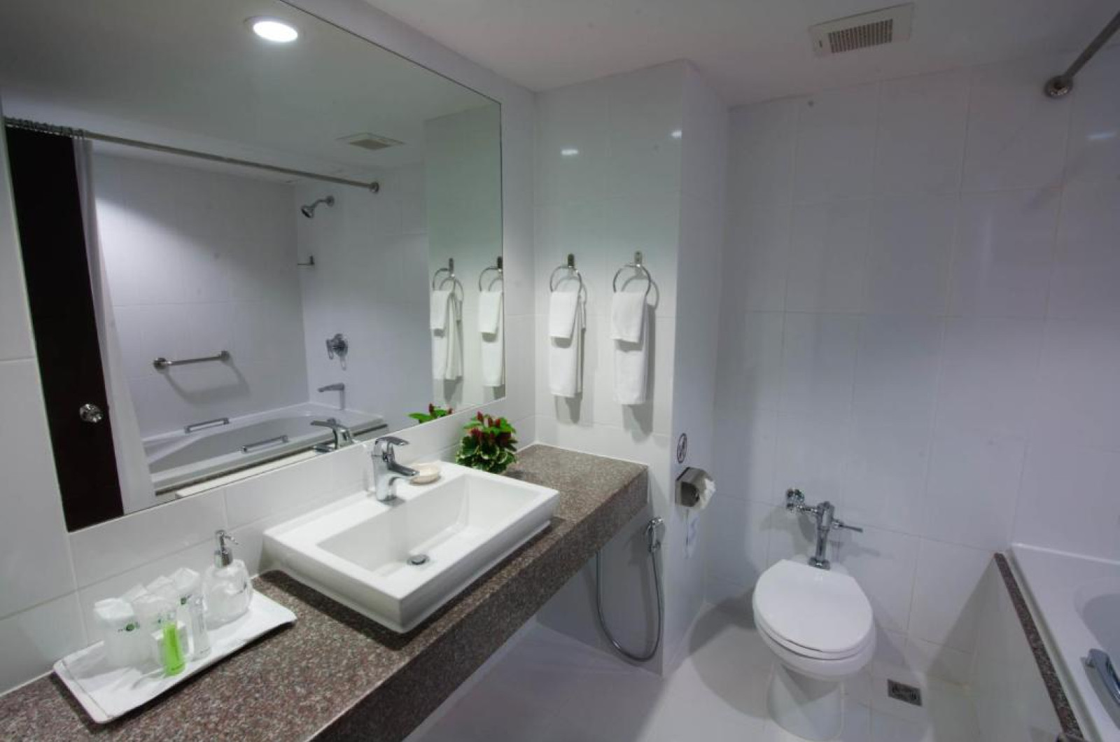 Camerele spatioase de la Patong Resort au minibar/frigider si balcon. Baia privată are cadă.