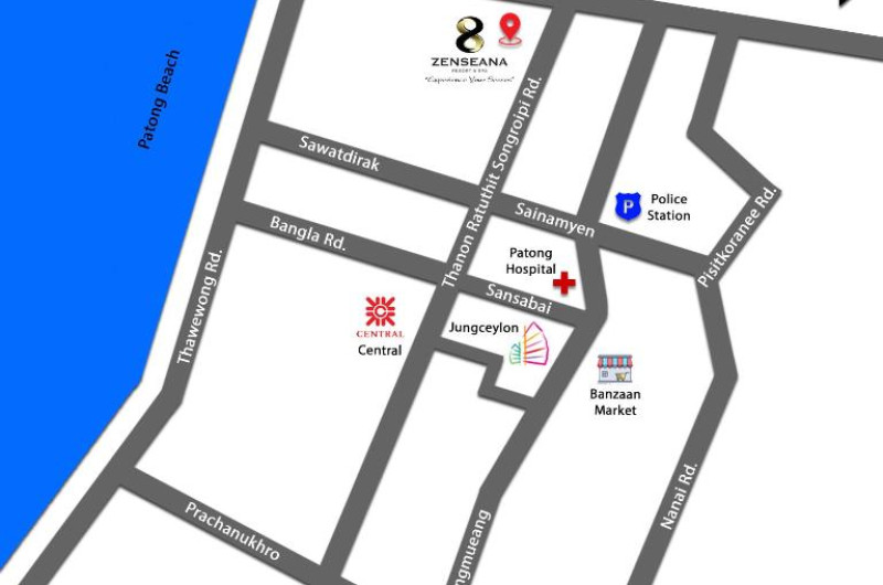 Cele mai populare puncte de interes situate in apropiere de Zenseana Resort & Spa includ plaja Kalim, centrul comercial Jungceylon și stadionul de box Patong. Cel mai apropiat aeroport este Aeroportul Internațional Phuket, situat la 39 km. Hotelul oferă un serviciu de transfer de la/ la aeroport, la un cost suplimentar.