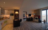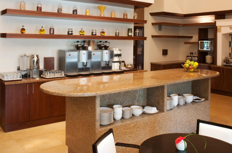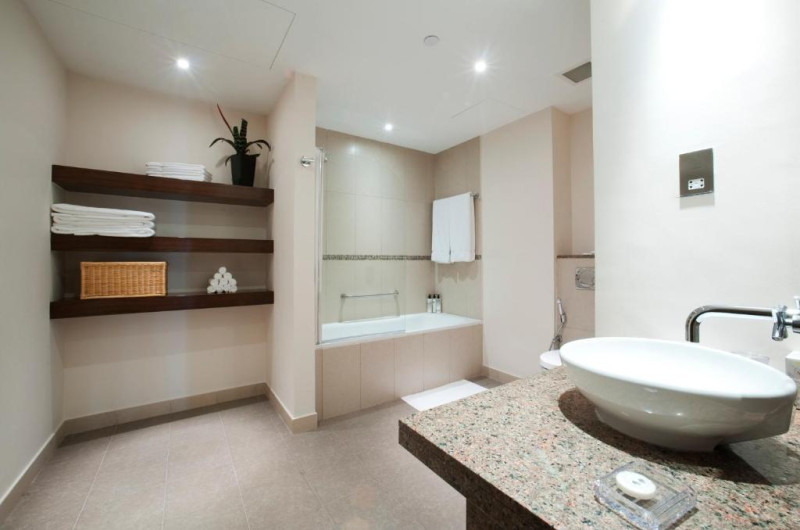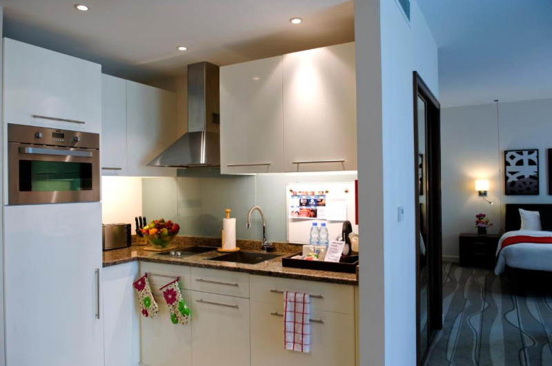 The Staybridge Yas Island’s air-conditioned accommodation has large windows and white linens on the plush beds. They all come with a fully equipped kitchen, a seating area and a 32-inch satellite LCD TV.