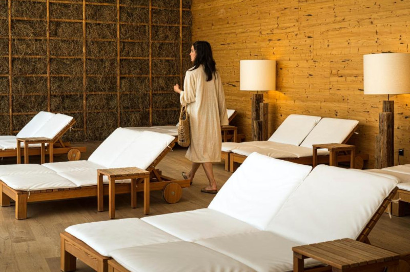 The Acquapura Spa includes an indoor pool, an outdoor pool, a sauna area, a private spa, a fitness area, and relaxation rooms.