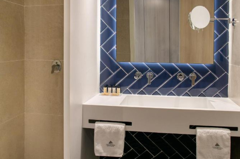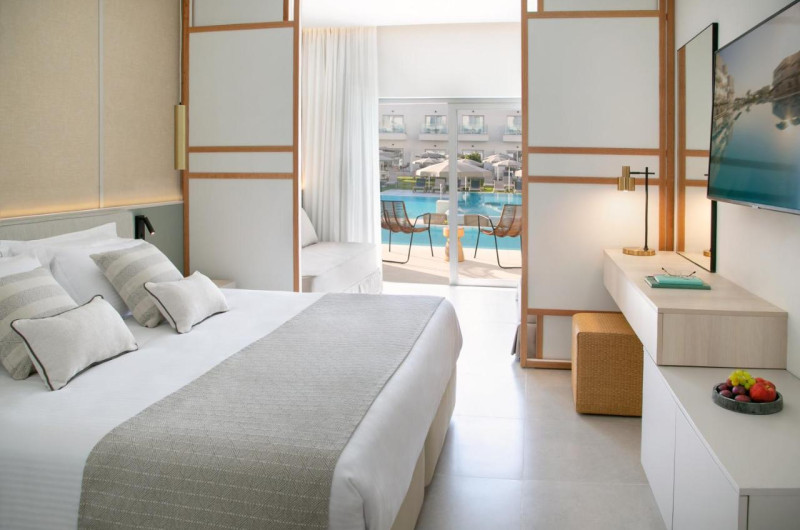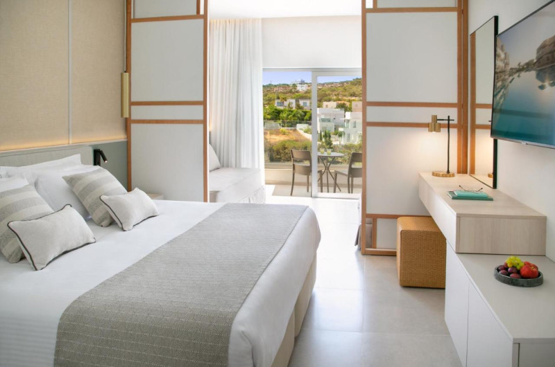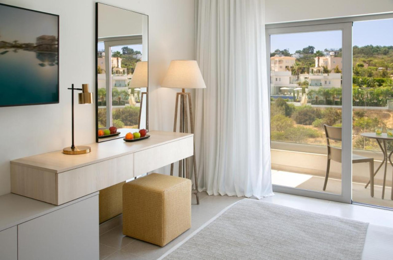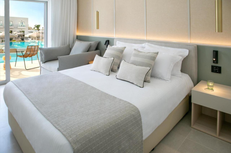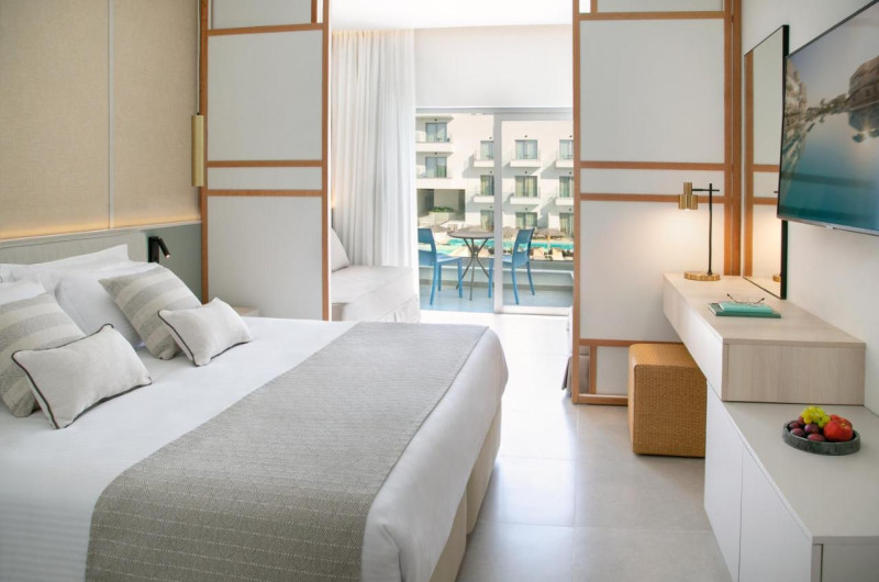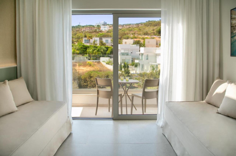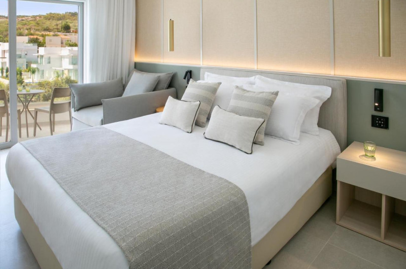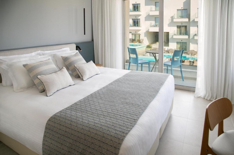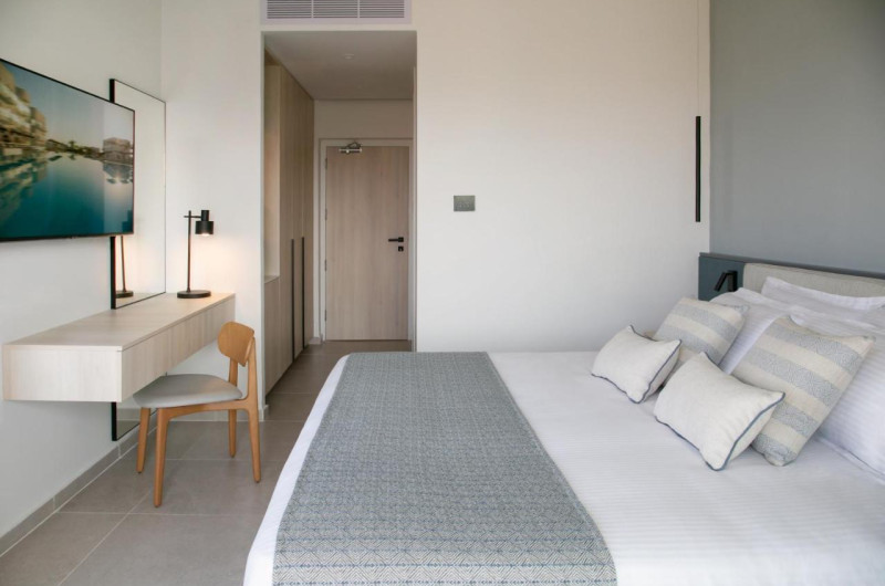 Camerele luminoase de la Atlantica Aqua Blue Hotel sunt dotate cu aer condiționat, Tv și seif. Fiecare cameră dispune de minibar și mașină pentru preparare cafea sau ceai. În camere există baie cu cadă sau duș, foehn, articole de toaletă gratuite, precum și halate de baie și papuci. Oaspeții au acces gratuit la serviciul Wi-fi în camere. Camerele au balcon cu vedere la mare sau la piscină. Curățenia in cameră se face zilnic.