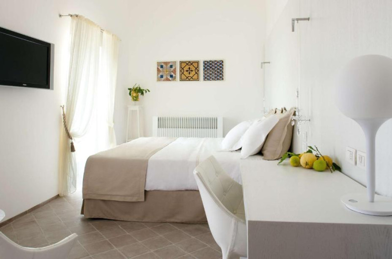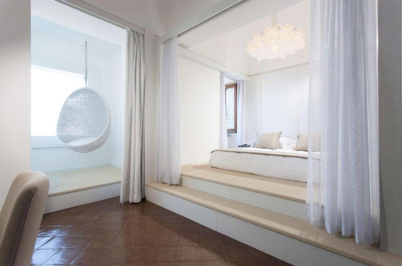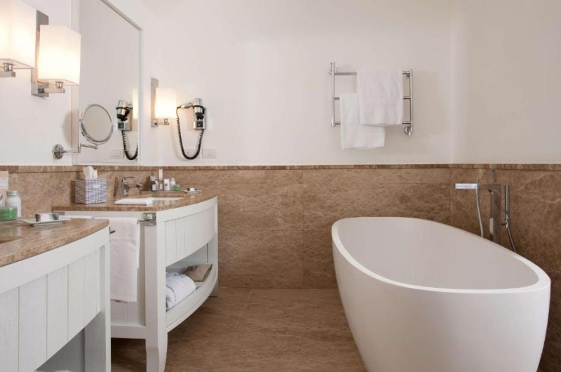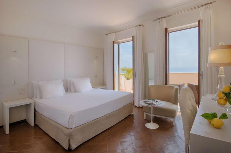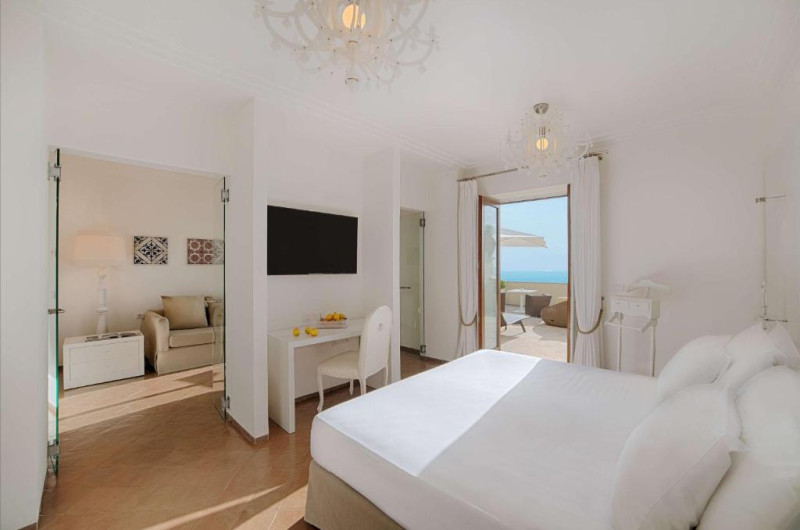 All rooms have sea views, terracotta floors and marble bathrooms. A flat-screen TV, minibar and pillow menu come as standard. Each private bathroom comes with a hairdryer and toiletries.